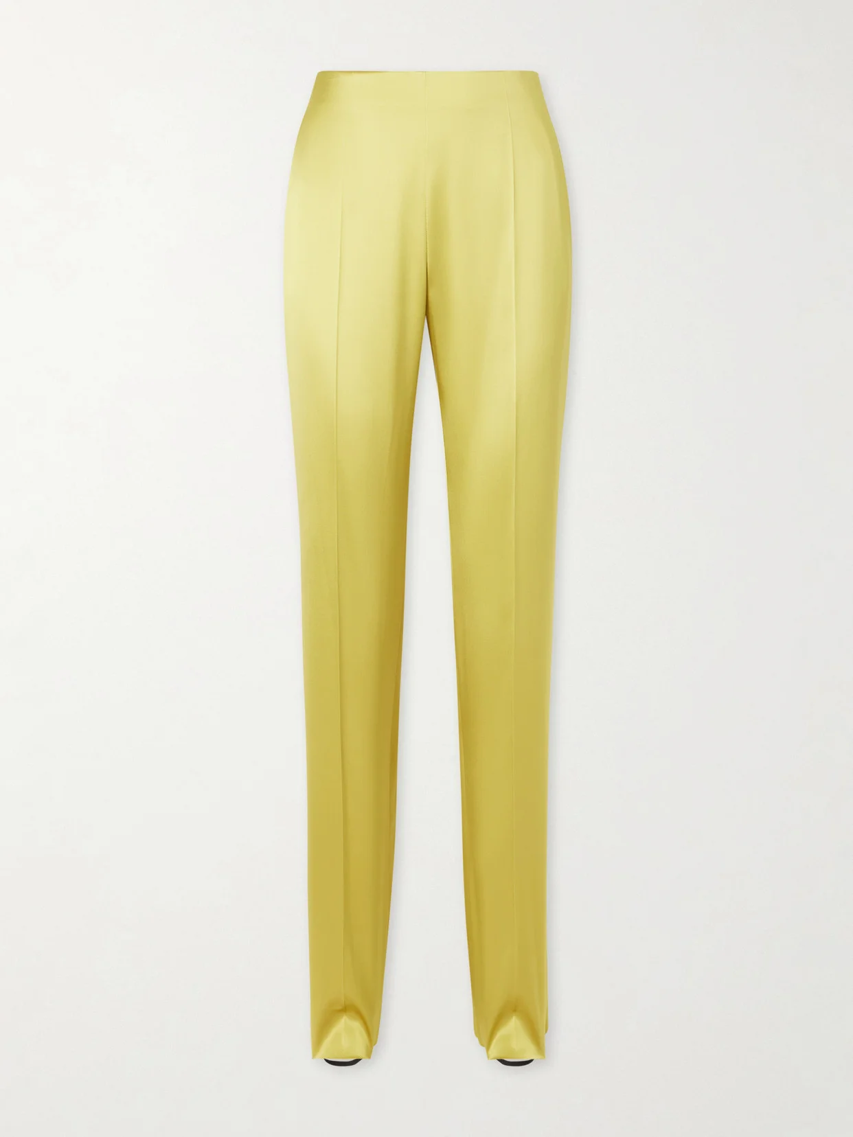 Valentino Garavani fuses fluid elegance with modern tailoring in these silk-blend duchesse pants. Cut for a high-rise fit with a slim, straight-leg silhouette that subtly flares at the hems, they create an elongated, sleek line. Pair with a fitted blouse and heels to highlight the refined shape and luxurious fabric.