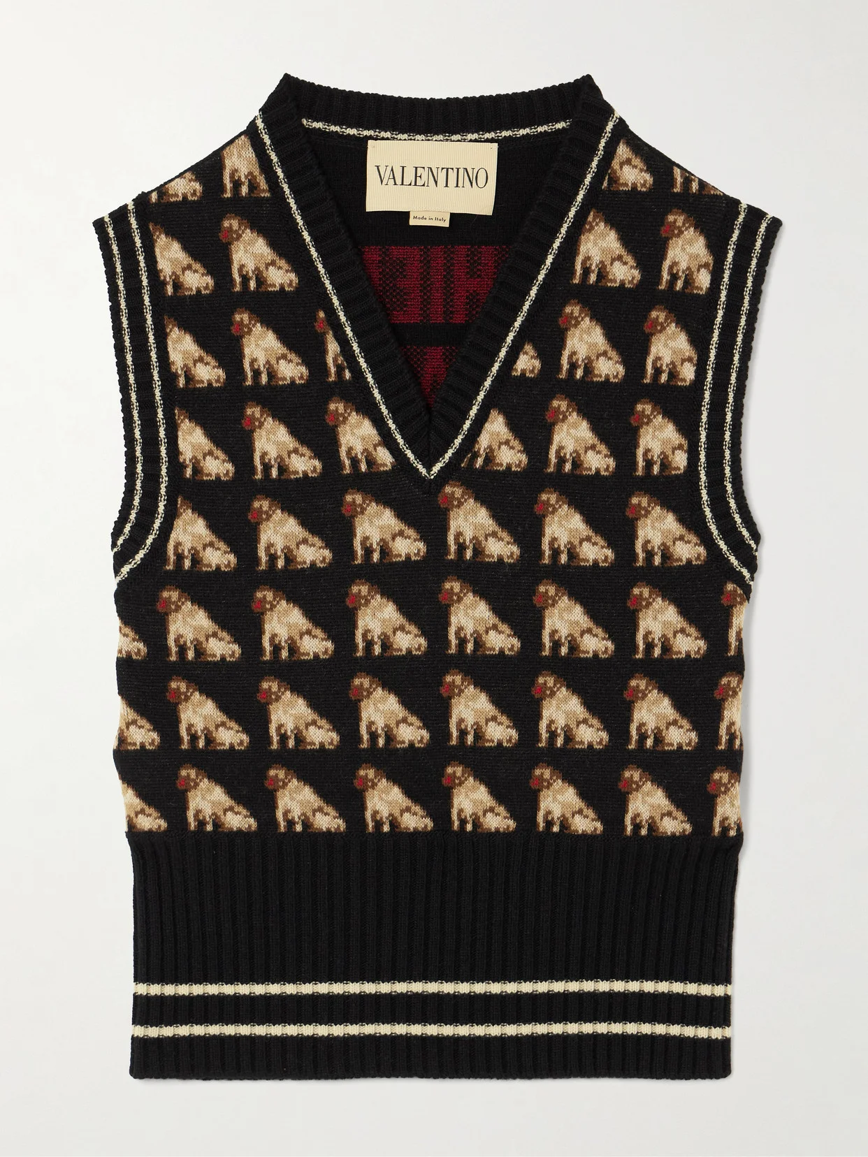 Valentino Garavani's collections have a playful charm. This vest is jacquard-knitted from soft virgin wool with sitting pooches and striped trims along the V-neckline and cropped hem. Wear yours layered over a ruffled blouse.