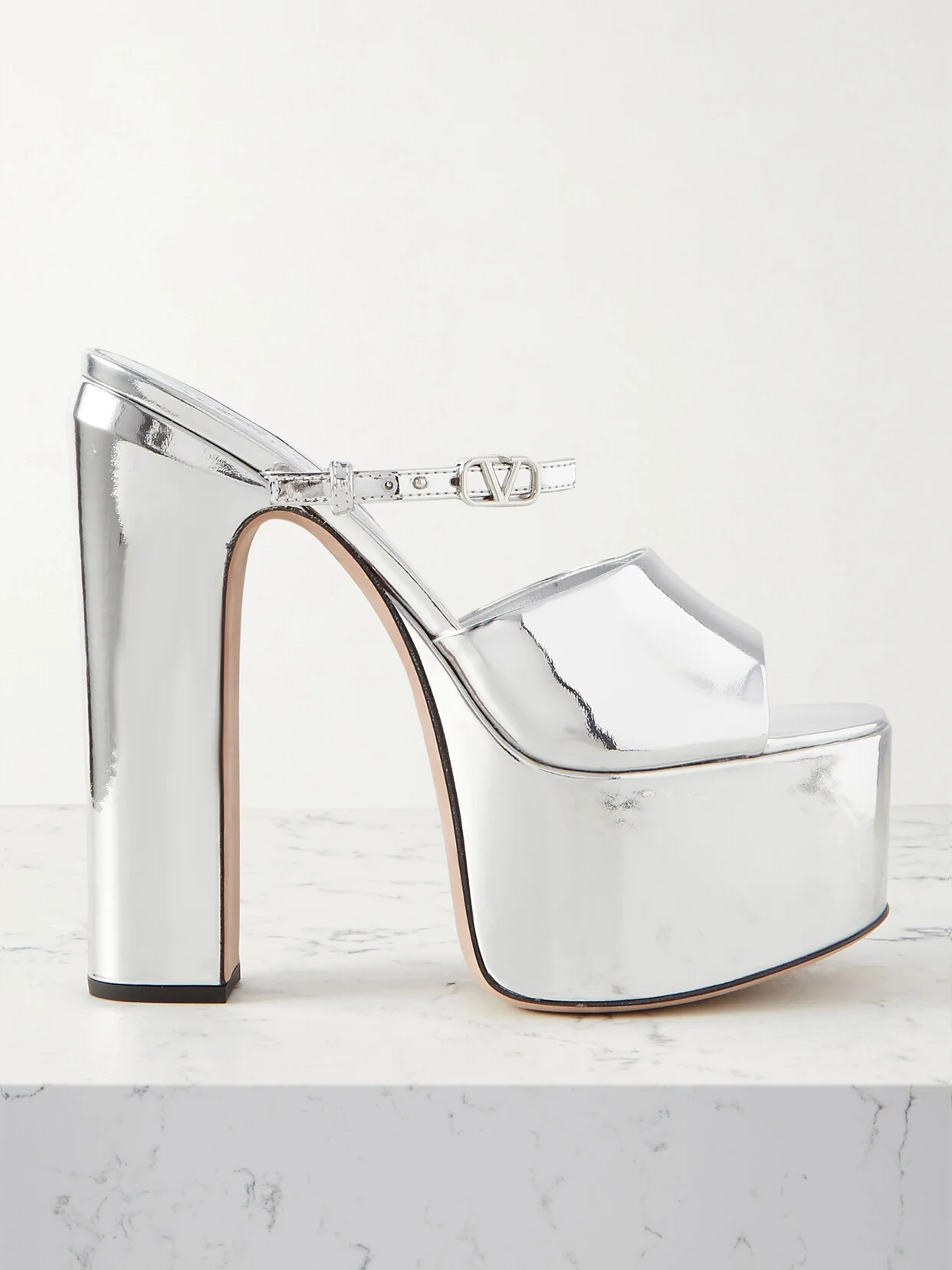 Valentino Garavani's 'Tan-Go' mules rest on towering 155mm platforms that are sure to make a statement. Crafted in Italy from shiny mirrored-leather, they have open toes and fasten with dainty logo-embellished ankle straps. Pair yours with mini hemlines.