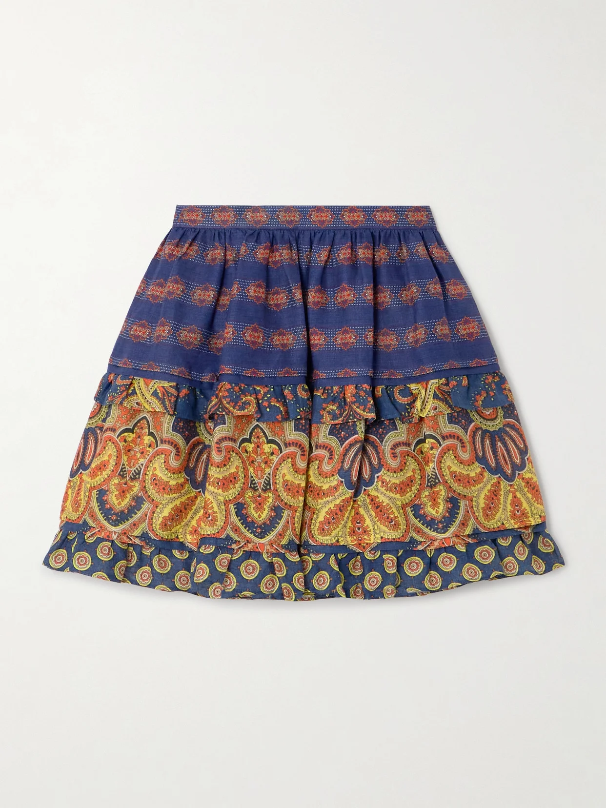 Tiered Embroidered Paisley-print Linen Mini Skirt