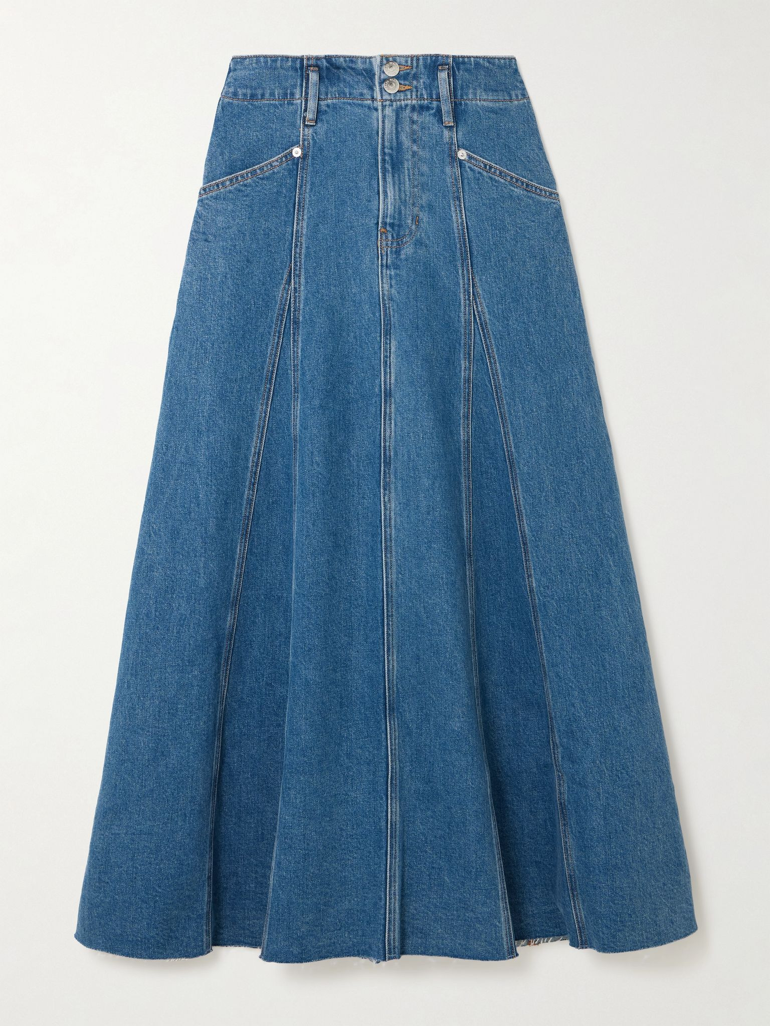 Veronica Beard's 'Alix' midi skirt has an A-line shape with raw edges for a relaxed feel. It's made from panels of denim and designed to sit high on the waist. Wear yours with mules or knee boots. Size & Fit - Fits true to size, take your normal size - Midi-length, designed to be worn at the waist - Mid-weight, slightly stretchy denim - Model is 177cm/ 5'10" and is wearing a US 2 Model measurements: - Bust: 77cm/ 30.5" - Waist: 62cm/ 24.5" - Hip: 88cm/ 34.5" Details & Care - Blue denim - Buttons and concealed zip fastening along front - 98% cotton, 2% elastane - Machine wash