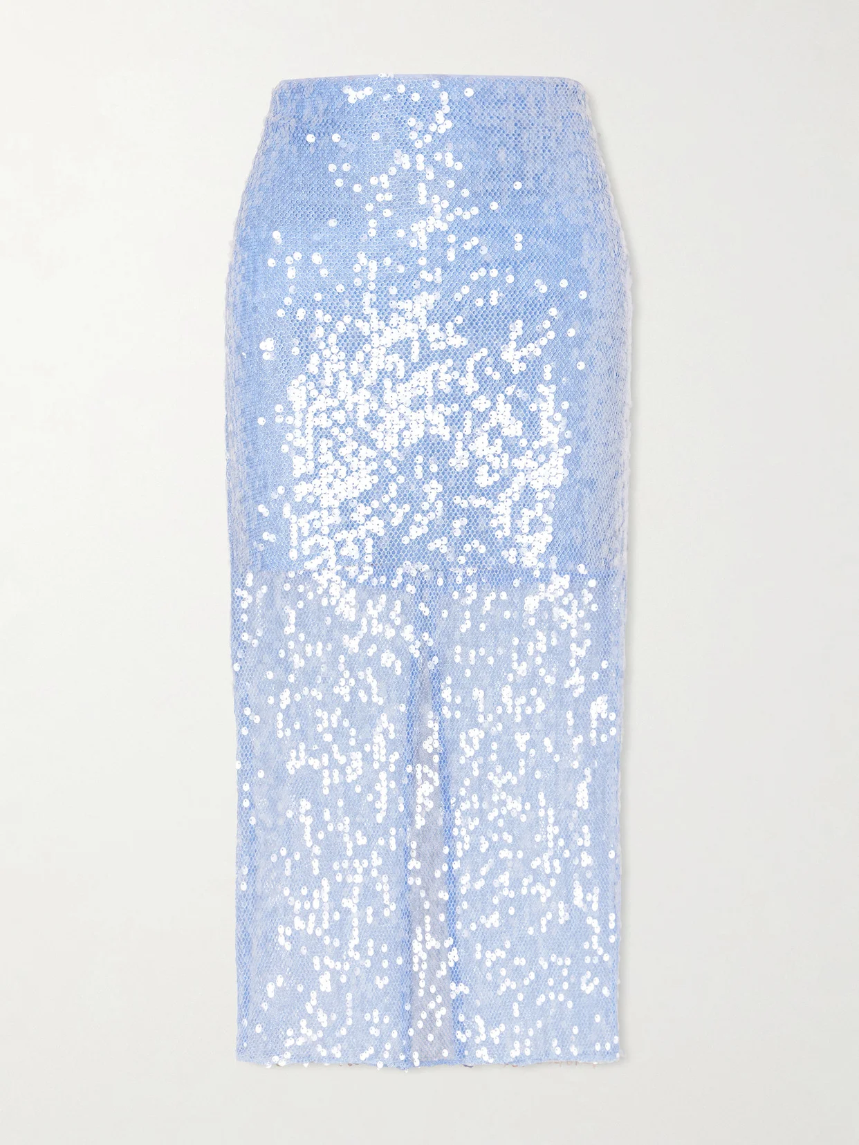 Veronica Beard's "Allora" skirt shimmers with sequins scattered across airy chiffon, creating movement and light with every step. The midi length tempers the sparkle with an elegant, wearable silhouette.