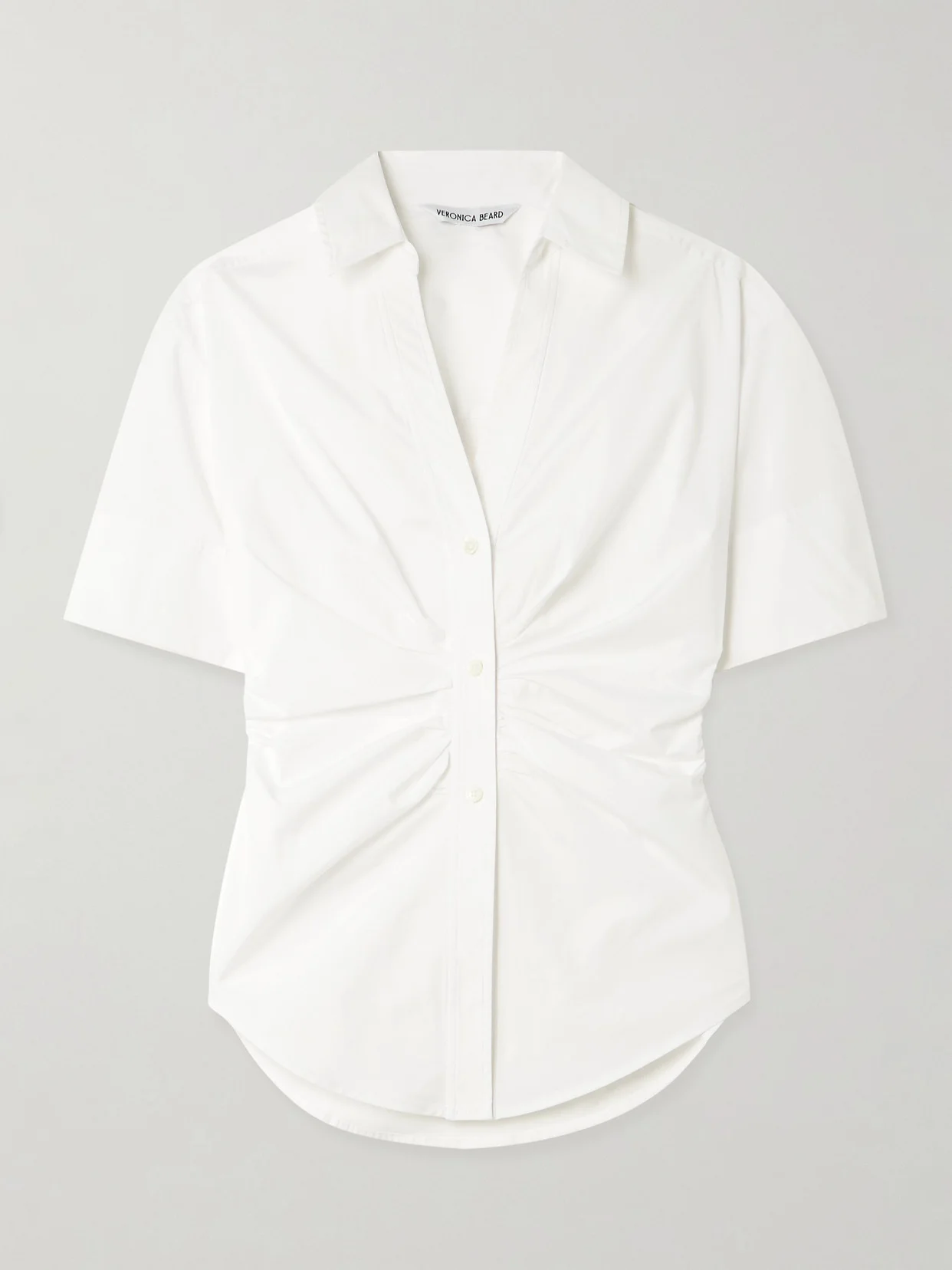 A fresh twist on a wardrobe essential, Veronica Beard's 'Devra' shirt is thoughtfully tailored with a modern, sculpted feel. Cut from cotton-blend poplin, it features subtle ruching through the waist and a classic button-down front that creates a contoured look. Wear yours with relaxed denim or pants.