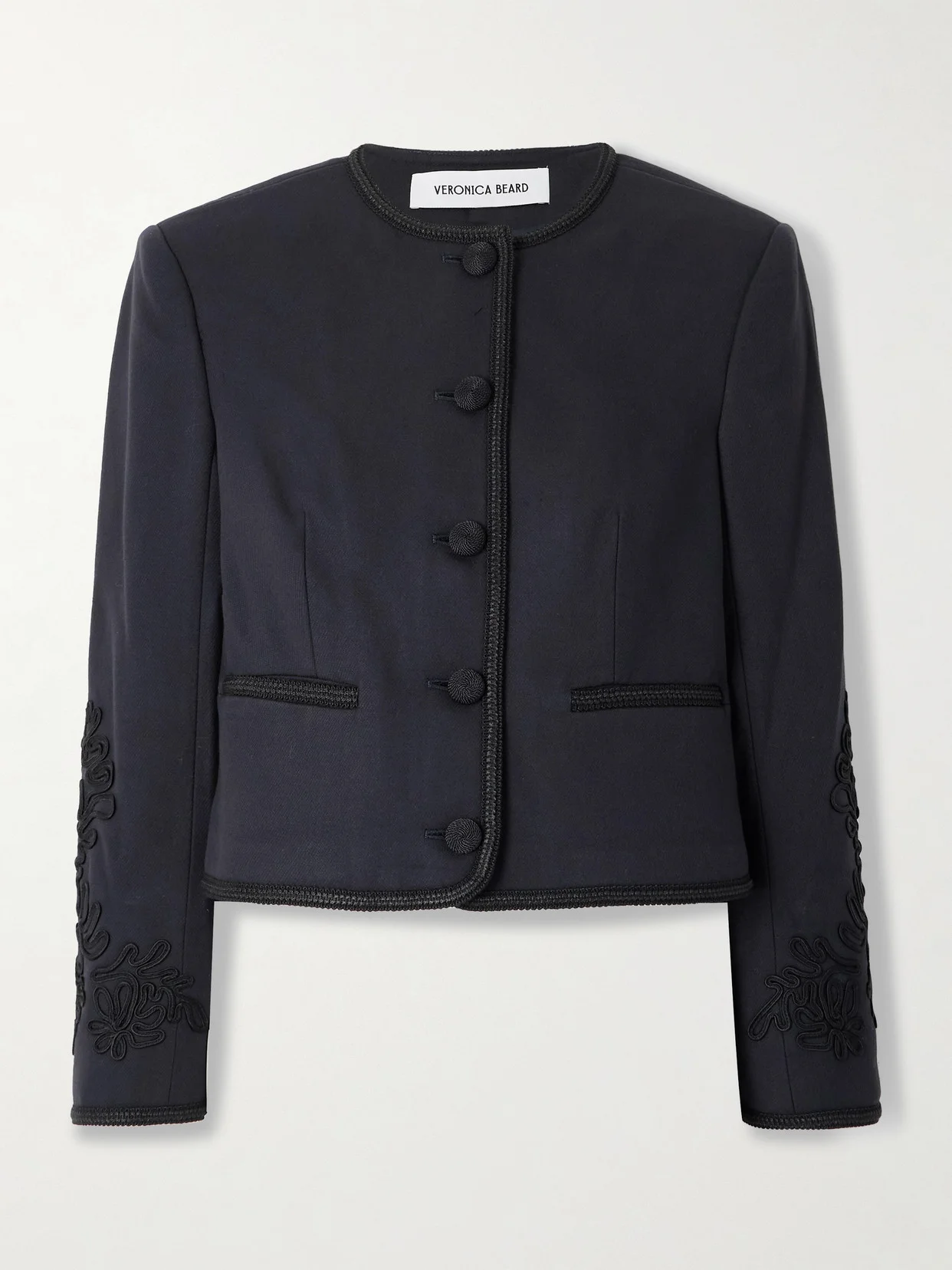 Veronica Beard's 'Latrell' jacket is designed with swirling embroidery that offers an ornate, decorative finish. It's woven with hints of wool in a slim, sophisticated shape with shoulder pads and a cropped hem traced with braided trims.