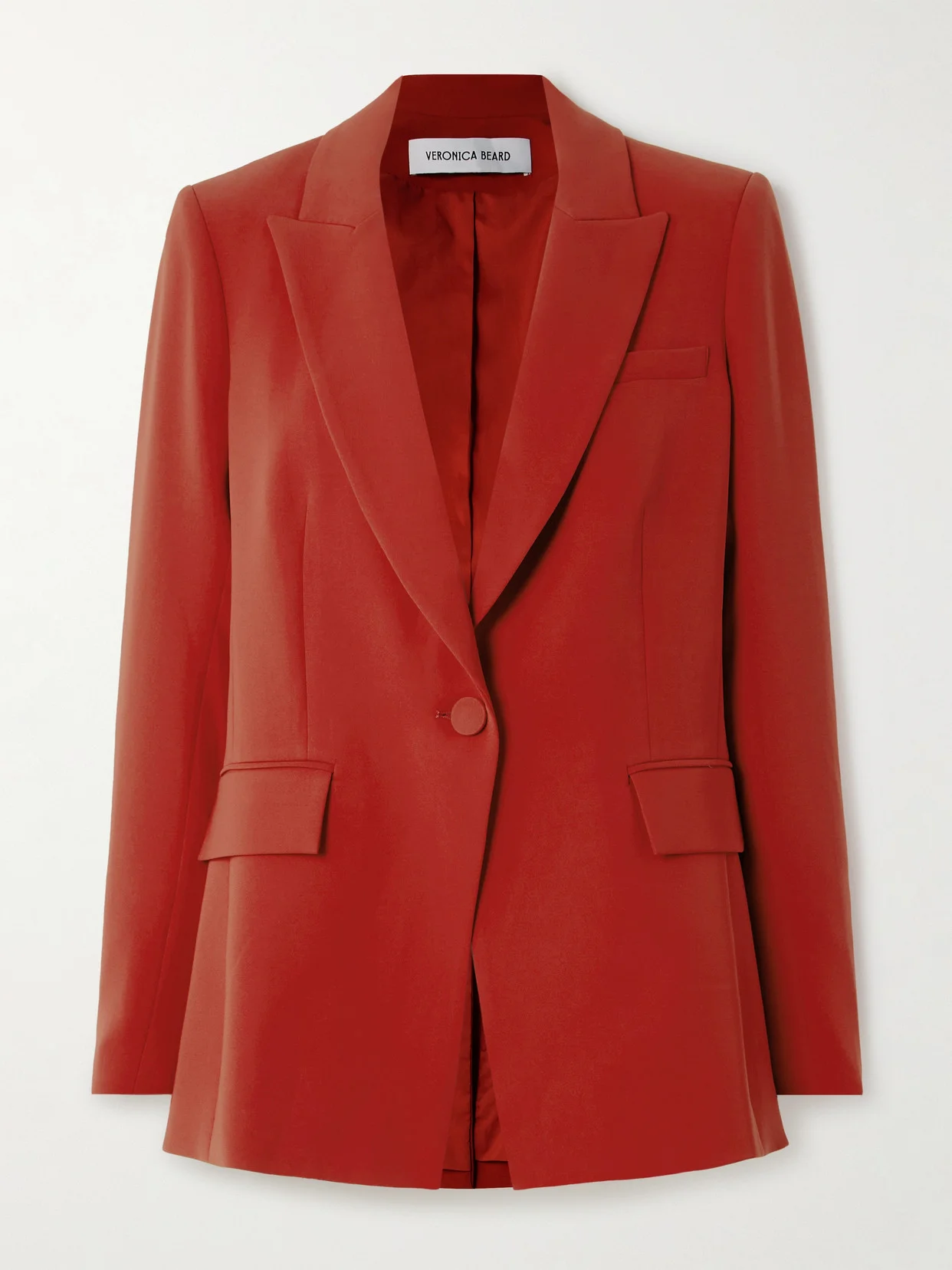 Veronica Beard's 'Long and Lean' blazer is named for its slender, extended silhouette, which reads elegantly. Part of the 'Dickey' line, it's tailored from crepe in vivid crimson - complement the shade with equally rich jewel tones.