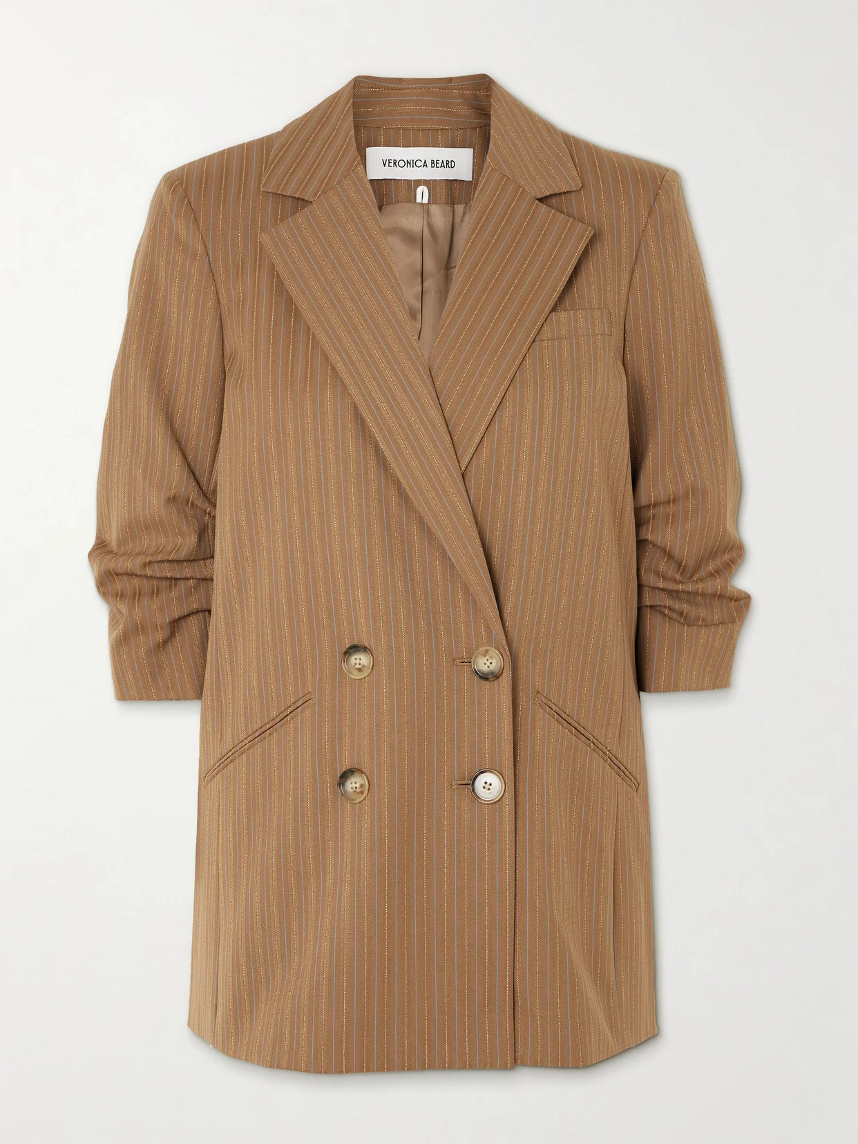 Veronica Beard's 'Rupert Dickey' jacket puts a fresh spin on the pinstripe blazer with a 'Malt; colorway and an effortless oversized shape. Finished with ruched sleeves and a double-breasted front, it balances sharp tailoring with a laid-back attitude.