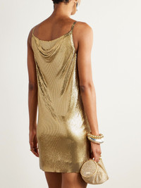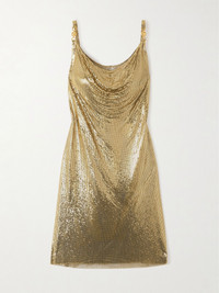 Versace's mini dress looks so similar to styles Kate Moss and Naomi Campbell wore to parties in the '90s. It's made from light-catching chainmail in a slinky silhouette and has a draped cowl neckline framed by embellished straps. Elevate yours with barely-there heels. Size & Fit - Fits true to size, take your normal size - Designed for a relaxed fit - Mid-weight, non-stretchy fabric - Model is 177cm/ 5'10" and is wearing an IT 40 Model measurements: - Bust: 86cm/ 34" - Waist: 65cm/ 25.5" - Hip: 90cm/ 35.5" Details & Care - Gold chainmail - Slips on - 100% metal; lining: 75% acetate, 25% silk - Specialist clean