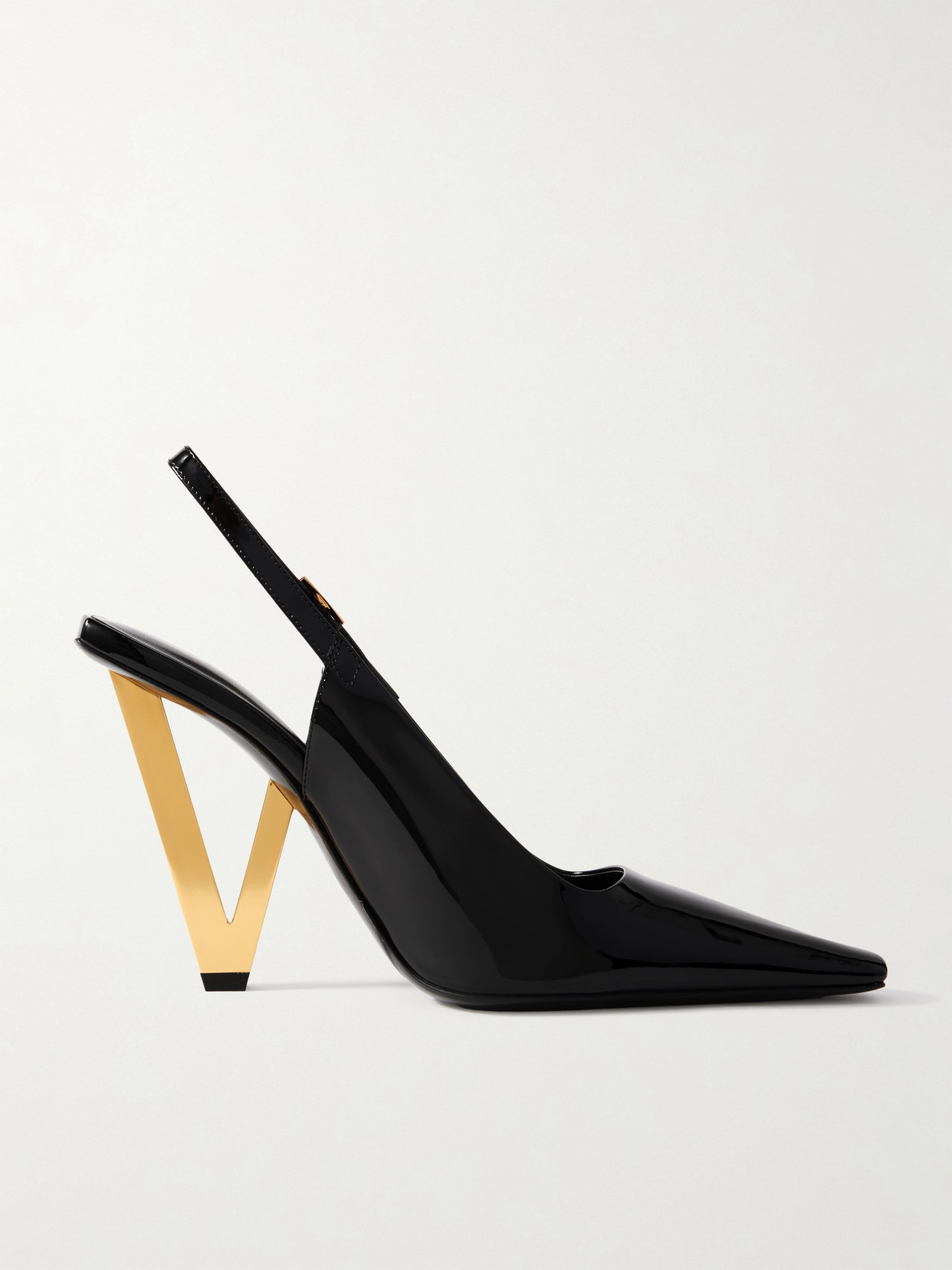 Versace's chic and glamorous pumps are set on sculptural gold-tone heels in the shape of the label's initial. They're made from glossy patent-leather and have sleek squared-off toes and an elasticated slingback strap.