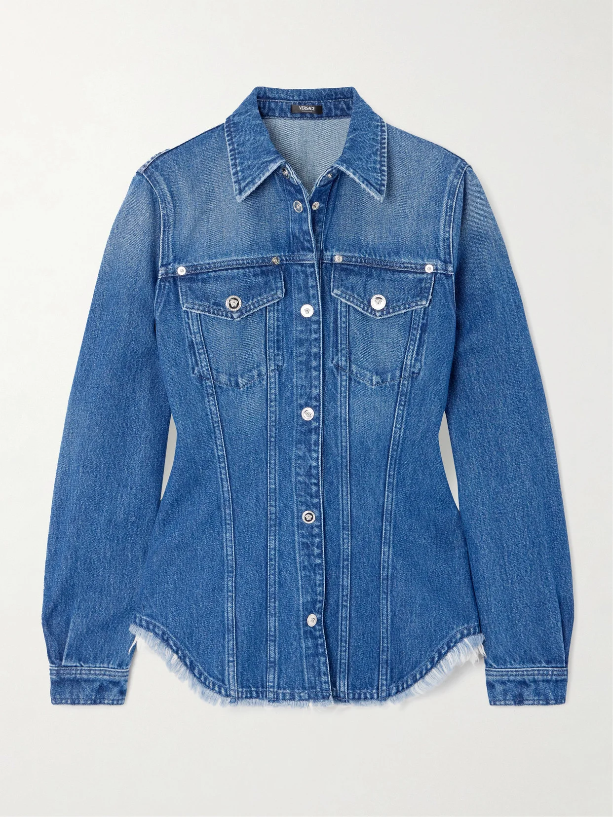 Versace pays special attention to the cut of this denim shirt, giving the classic design a fresh update with a cinched-in waist. It's made from denim and has a frayed hem and flap pockets featuring the silver-tone ‘Medusa' buttons.