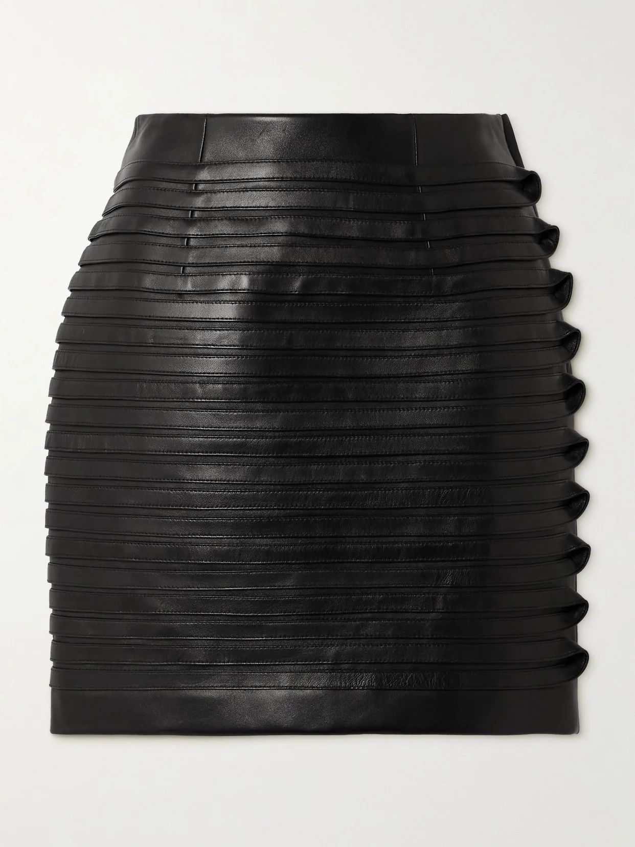 Versace's mini skirt is overlaid with slim strips of leather which curl and curve at the side, creating a ribbed effect. Wear yours with a fine-knit black turtleneck to mirror the Fall '24 runway styling.