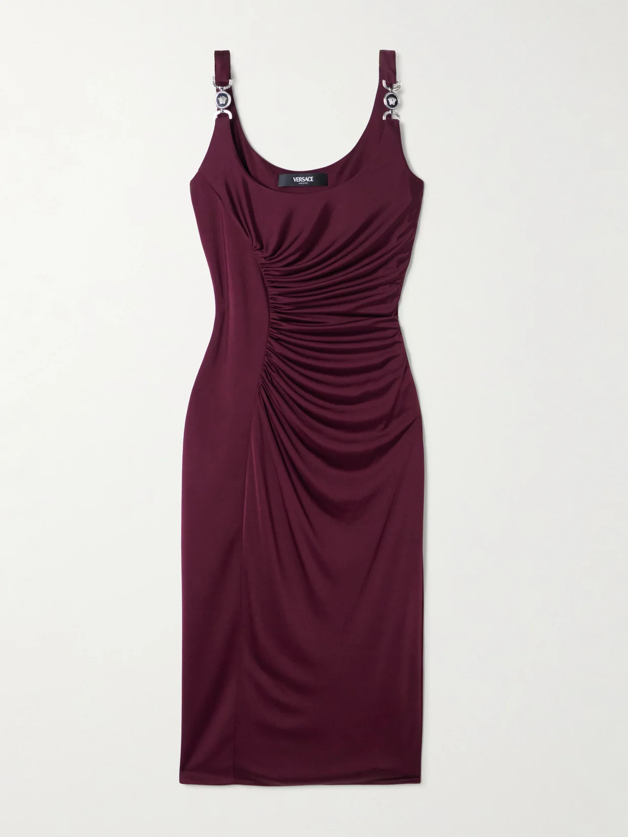 Versace's dress is cut from lustrous satin-jersey that molds to the body, creating a sculpted silhouette enhanced by artful ruching. The fluid fabric catches the light beautifully, while signature silver-tone medallions at the straps add unmistakable glamour.