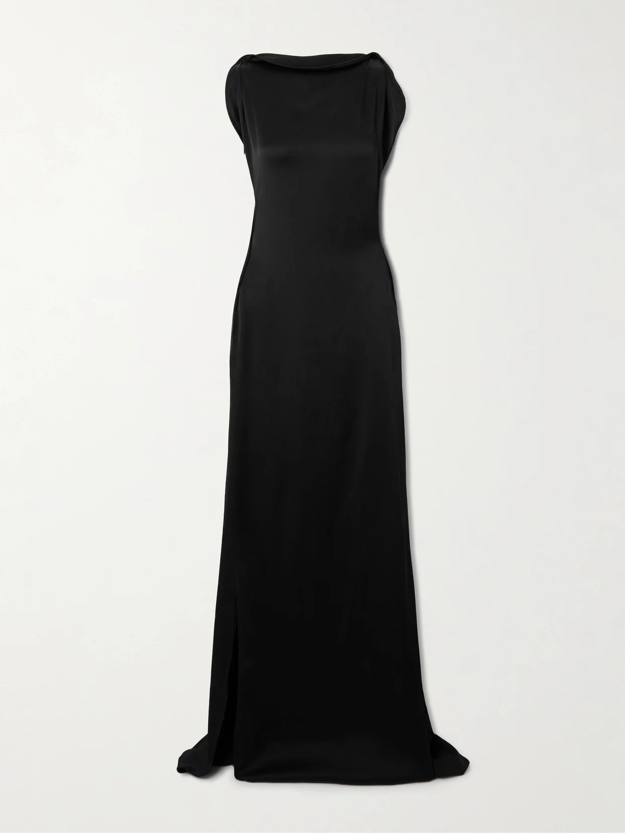 Victoria Beckham's gown debuted on the Fall '25 runway, which captured the designer's vision of modern femininity. It's made from satin-crepe and has a draped neckline and floor-pooling hem. The front split will show off your heels.