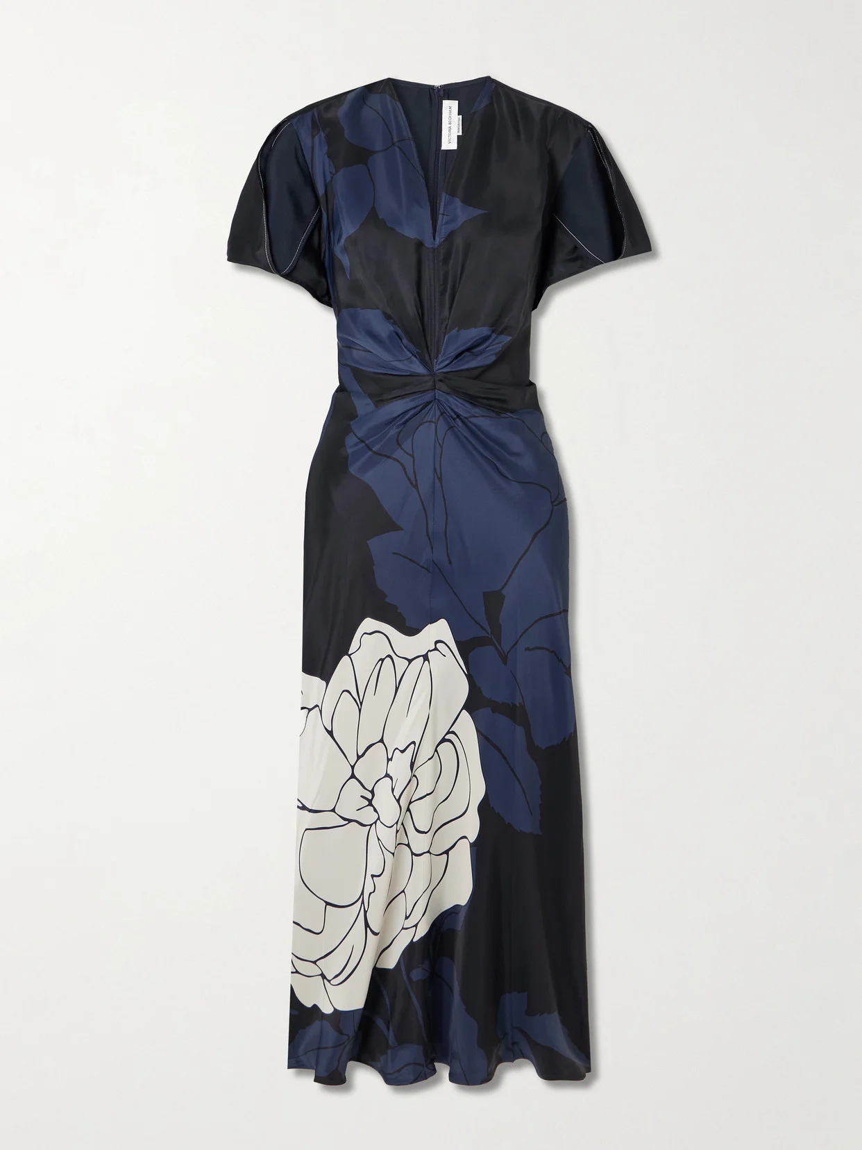 Victoria Beckham's elegant 'Eve' midi dress is printed with graphic florals. It's made from smooth satin that's gathered at the waist and has fluttery tulip sleeves. Wear yours with point-toe pumps.