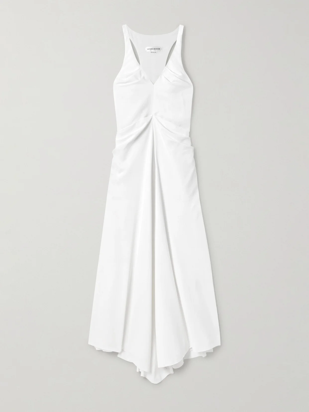 Victoria Beckham's dress was spotted at the brand's Fall '24 show in Paris, where the swathes of duchesse-satin billowed as the model walked the runway. Cut with a plunging neckline, this style is artfully gathered and pleated to create the perfect shape, while the racer-back and side pockets feel a little more modern and relaxed.