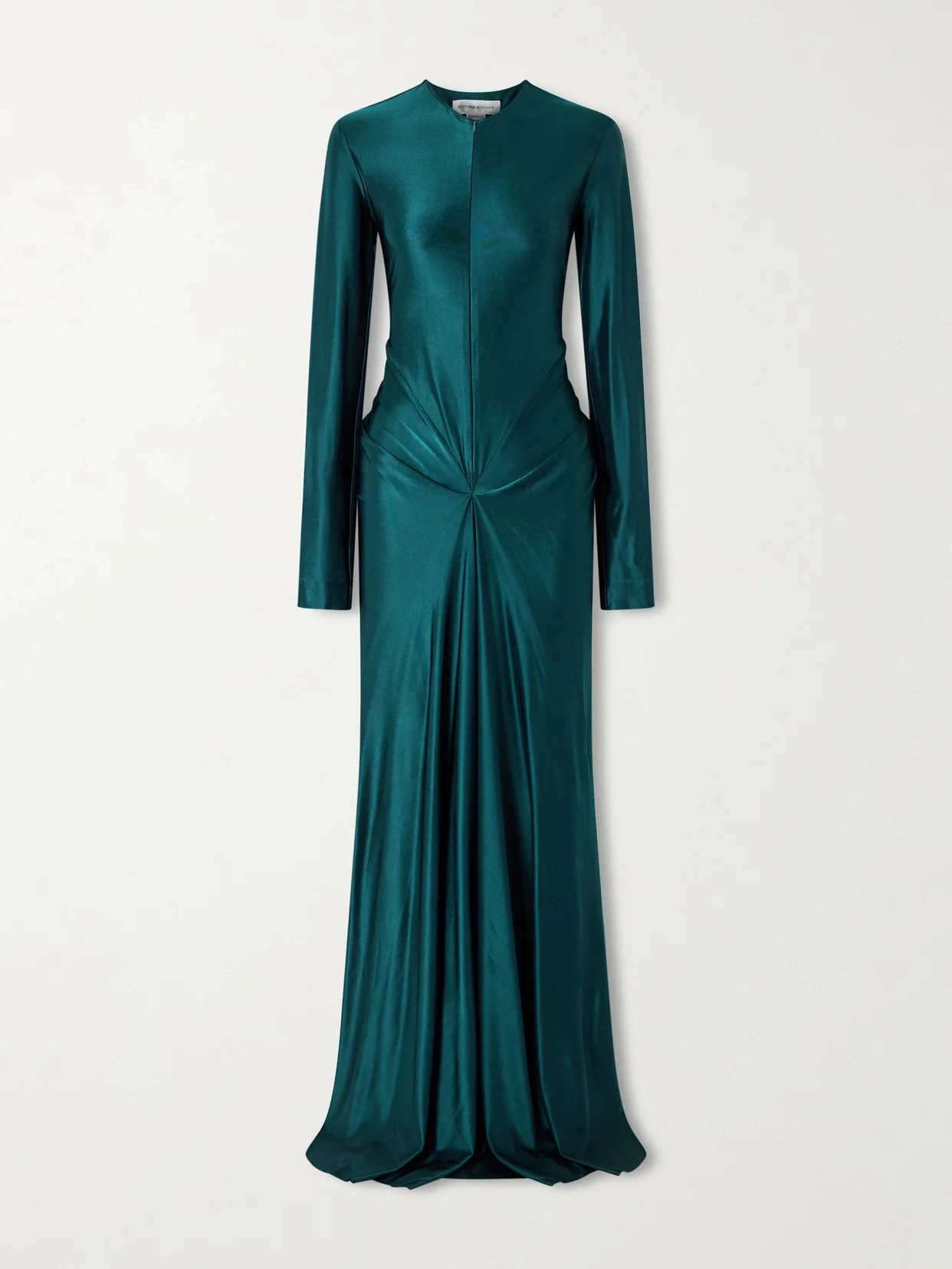 Victoria Beckham knows exactly what it takes to make an unforgettable entrance. This gown is made from lustrous satin with a plunging neckline and gathered waist and falls to a glamorous floor-pooling hem. Accessorize with diamond earrings and a sculptural clutch.