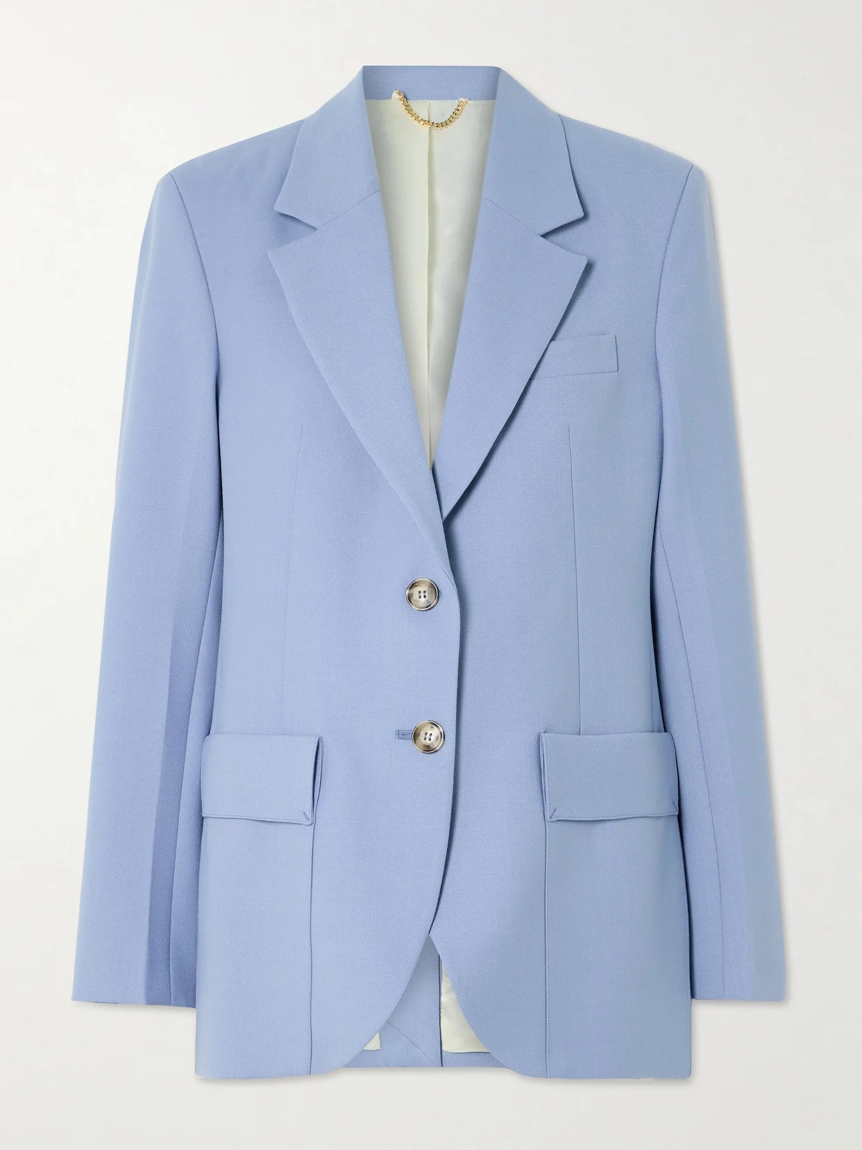 The hushed 'Bluebell' shade of Victoria Beckham's blazer is so effortless and elegant - it'll look beautiful with the matching pants, but you could team it with neutrals to add a little color, too. Meticulously tailored from twill, it has neat, slim proportions with notch lapels and two buttons closing the front. The interior is lined in glossy satin for a luxurious feel.