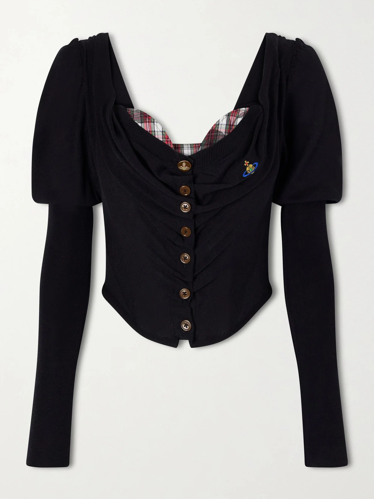 Vivienne Westwood's 'Bea' cardigan highlights all the codes typically associated with the designer's aesthetic: feminine, a little vampy and covetable. Made from a soft wool and silk-blend, it has a corset-inspired shape with tartan cotton cups peeking from the draped neckline. The puffed shoulders lend a dramatic finish.