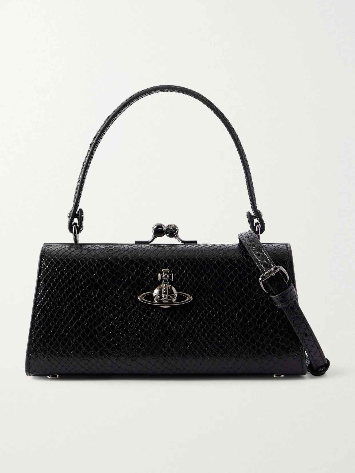 Vivienne Westwood's "Doll XL" mini bag distills the house's rebellious elegance into a compact statement piece. Made from croc-effect leather, the structured silhouette is punctuated by silver-tone logo hardware and sized to hold essentials like a phone, cardholder, and keys.