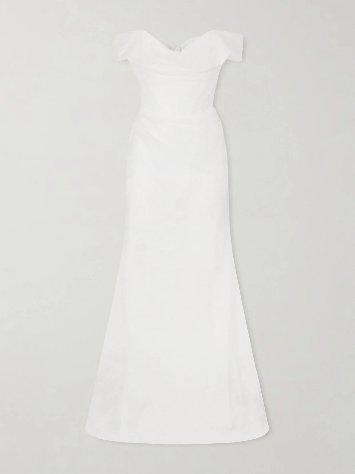Vivenne Westwood's bridalwear balances romance with drama. This 'Nova Cora' gown is made from satin layered with fine floral lace and features a draped off-the-shoulder neckline and an internal corset for support and structure. It's lightly gathered through the waist and has a fishtail skirt.