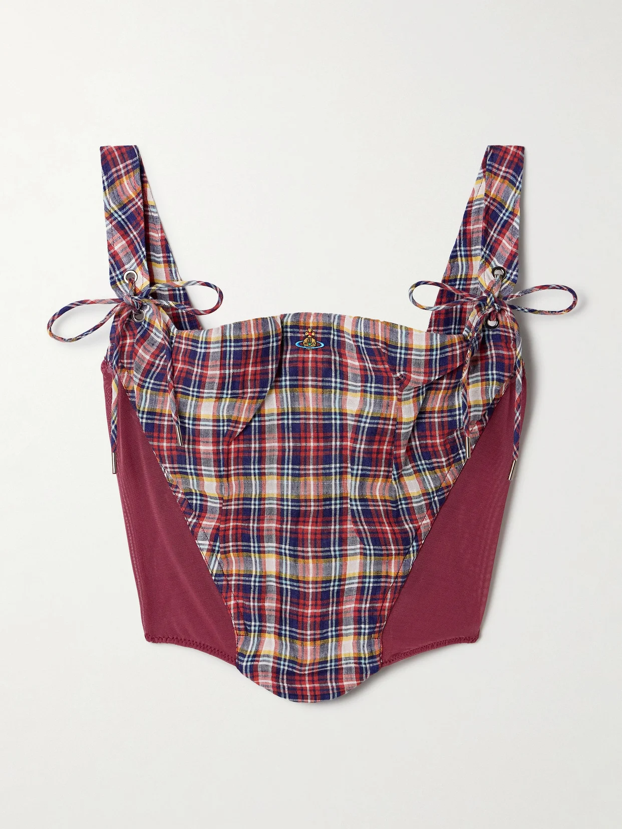 Vivienne Westwood's 'Puppy' bustier top is part of a coordinating set with the 'Nymph' skirt. Fitted with internal boning for structure, it's made from checked linen and cotton-blend and has breathable mesh panels. Adjust the straps to a comfortable length.