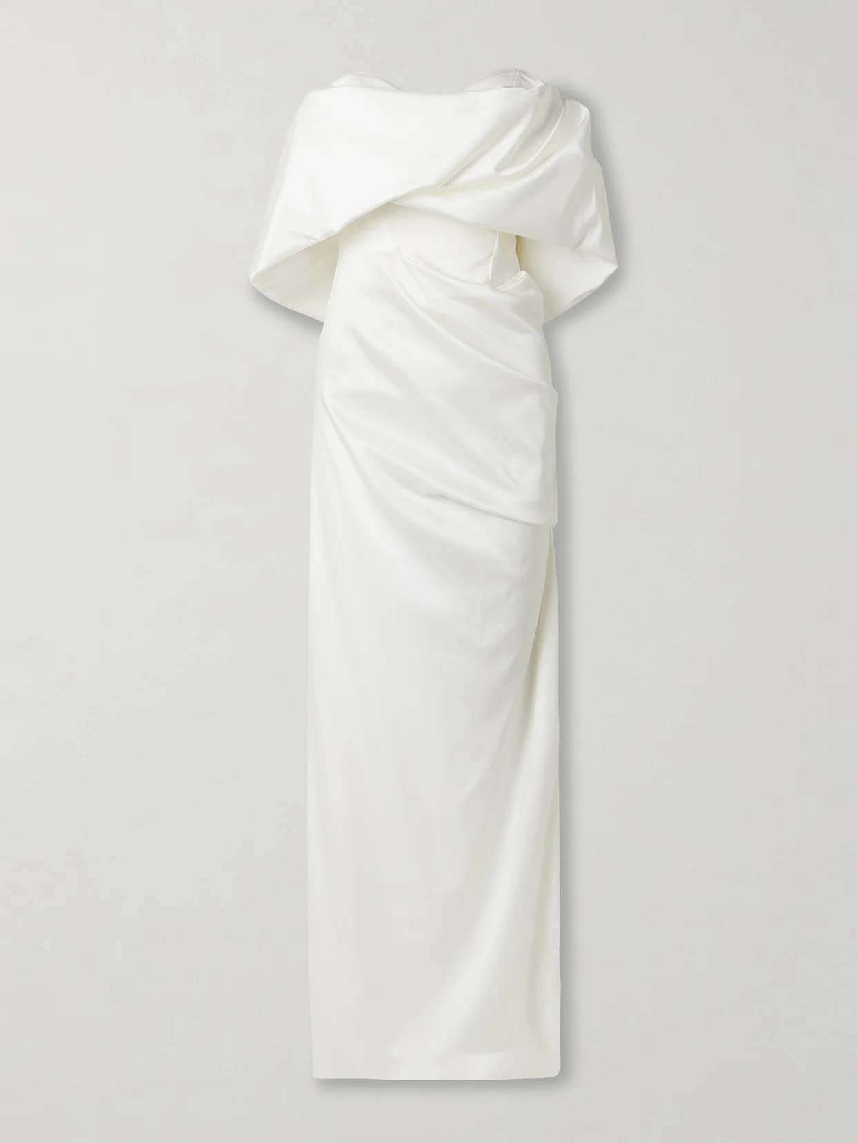 There's an effortless romance to Vivienne Westwood's bridal designs. This satin 'Sybyl' gown has a dramatic off-the-shoulder neckline and is draped through the bodice, which is fitted with an internal corset for support. Small to size. See Size & Fit notes.