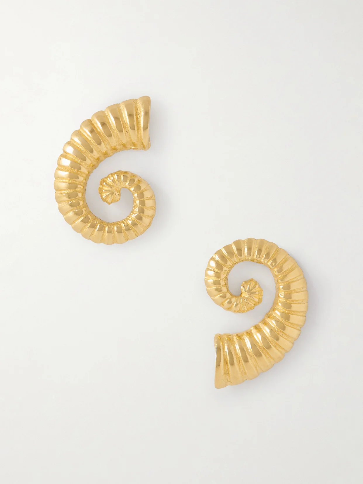 Mother-and-daughter duo Alexia and Stalo Karides draw on their shared memories of collecting shells by the sea to create YSSO's nautical '1989' earrings. They've been crafted in Greece from lightweight gold-plated bronze and carved with grooves that glisten as they catch the light. Responsible Craftsmanship. This product promotes artisanal skill and brands that invest in communities and adhere to fair-trade principles. Find out more about our NET SUSTAIN criteria here.