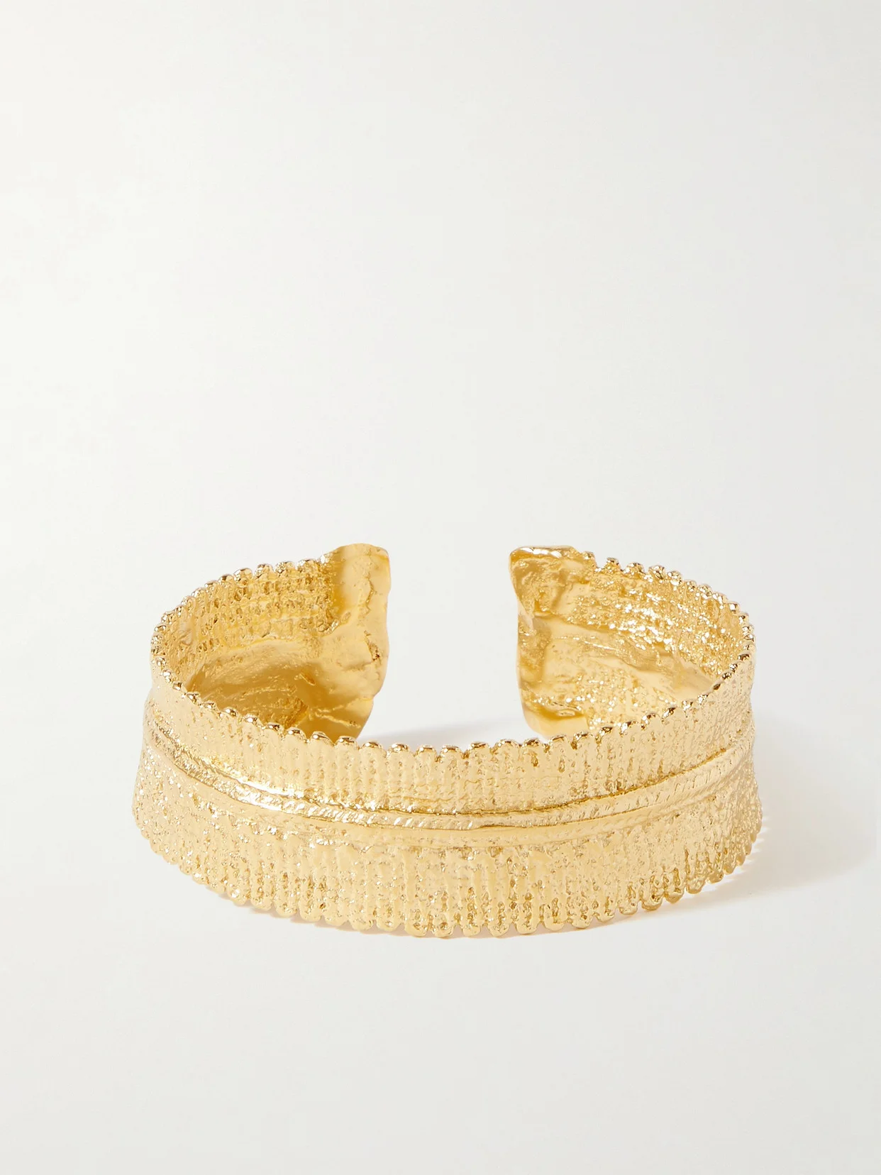 Founded by mother and daughter duo Alexia and Stalo Karides, YSSO's collections are inspired by their Hellenic heritage. Named after the Ancient Greek Goddess of the hunt, wilderness and moon, this 'Artemis' bracelet is handmade from gold-plated metal and has a rustic, etched pattern that forms a scalloped edge along the wide, adjustable band. Responsible Craftsmanship. This product promotes artisanal skill and brands that invest in communities and adhere to fair-trade principles. Find out more about our NET SUSTAIN criteria here.
