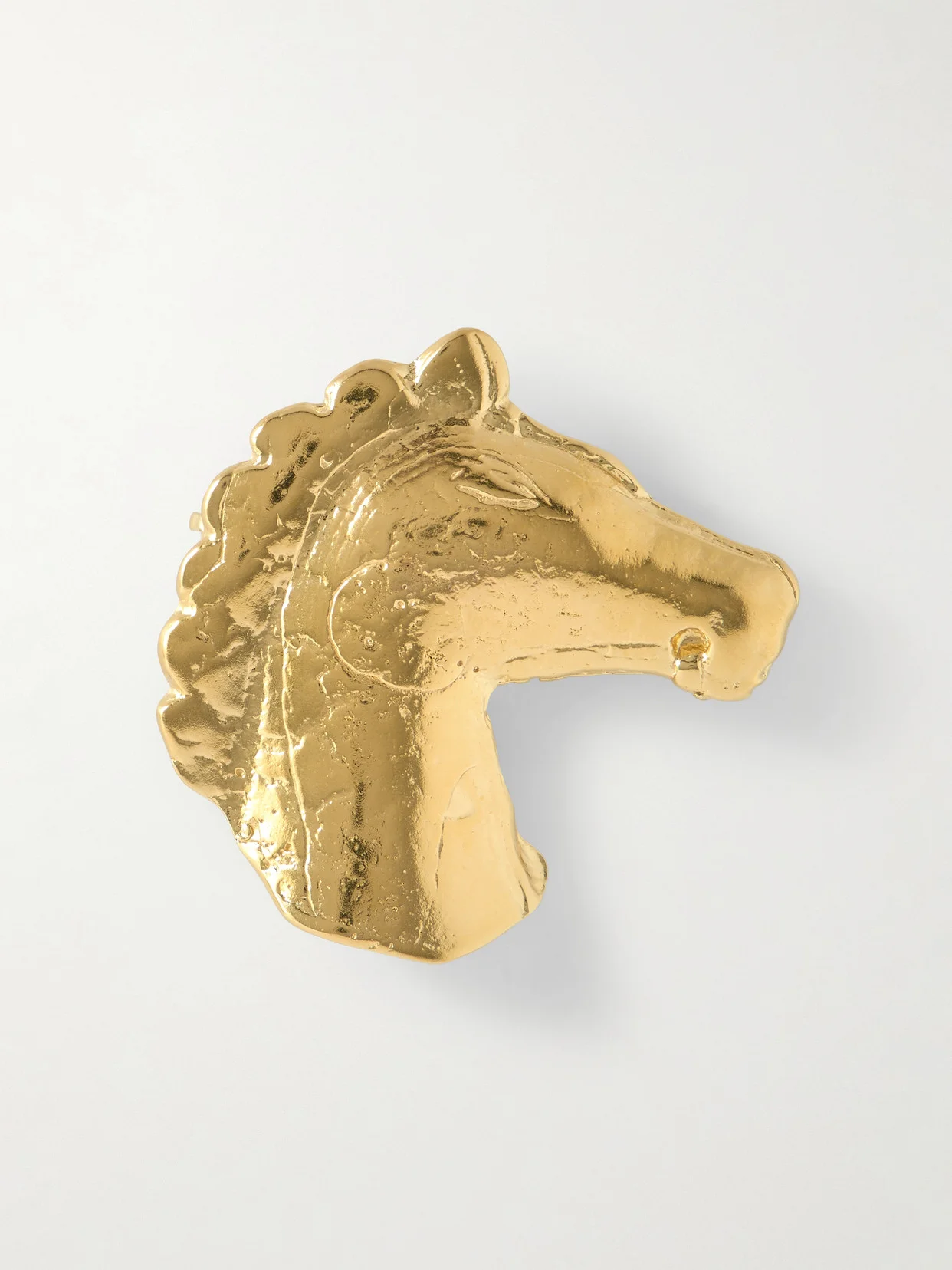 The YSSO's mystical collections are a celebration of the founders' Greek heritage. This 'Equestrian Dream' brooch is handcrafted in Athens from gold-plated metal and modeled in the shape of the 'Hippoi Areioi' - one of the four immortal horses in Greek mythology. Pin yours on the lapel of your everyday coat. Responsible Craftsmanship. This product promotes artisanal skill and brands that invest in communities and adhere to fair-trade principles. Find out more about our NET SUSTAIN criteria here.