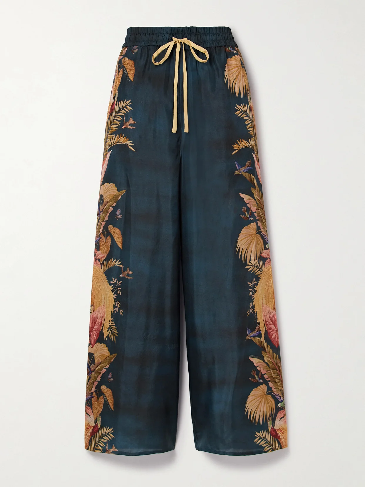 Zimmermann's pants are printed with a beautiful scene of hummingbirds and dragonflies fluttering amongst lush plant life. They're cut from fluid silk-satin and fall to pooling wide legs. Adjust the drawstring waistband to a comfortable fit.