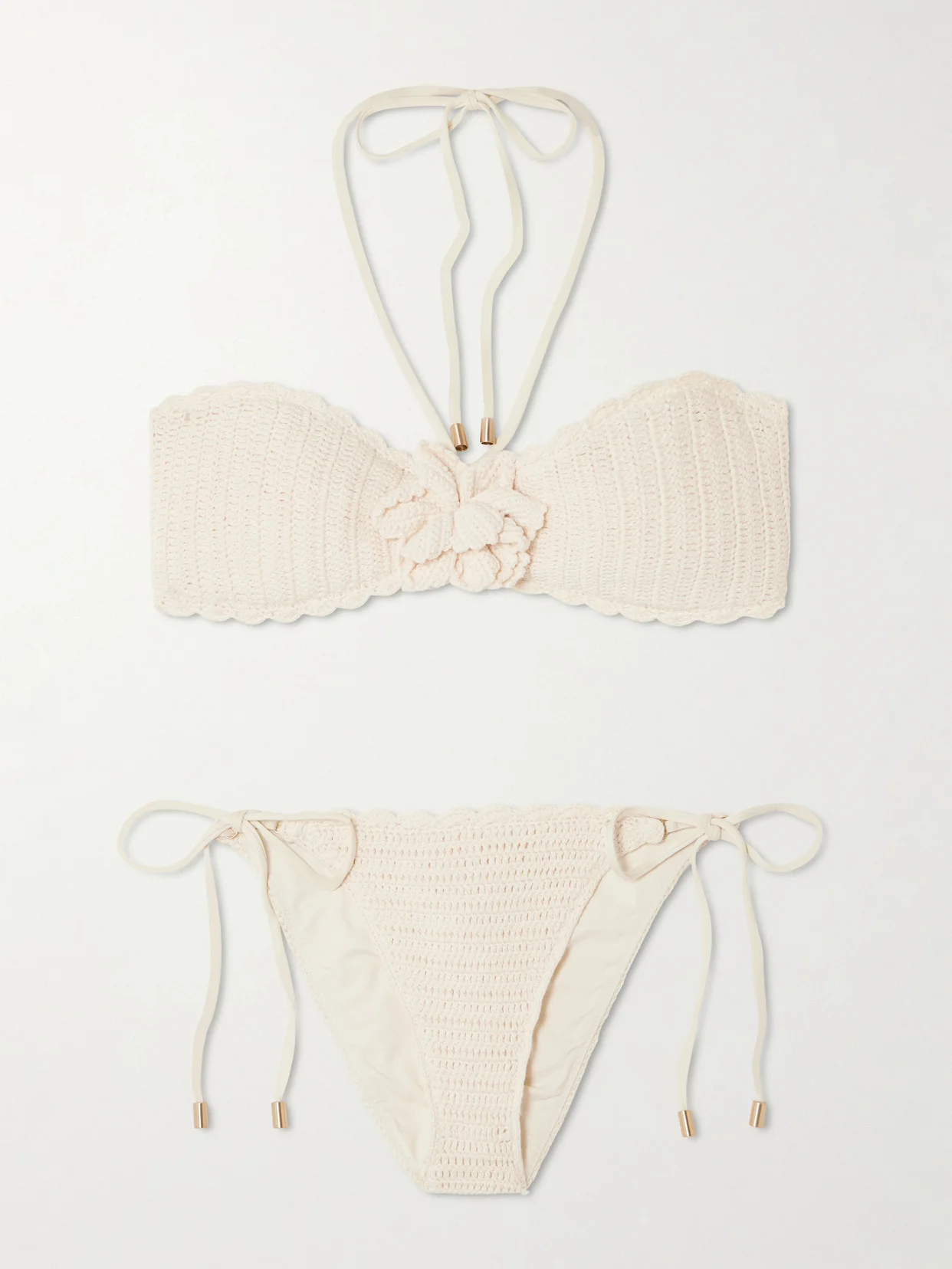Zimmermann's swimsuits are just as romantic and bohemian as the label's ready to wear. This 'Awaken' bikini is crocheted from cotton and has a dainty flower at the center of the bandeau top. Adjustable halter and side ties ensure a perfect fit every time.
