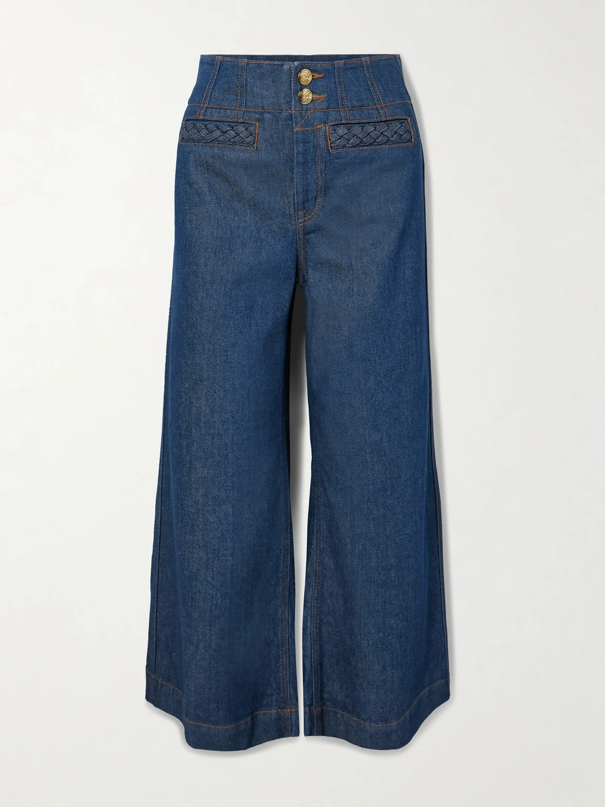 Zimmermann's 'Awaken' jeans have a '70s feel thanks to their cropped, flared hems. Designed to sit high on the waist, they're made from dark-blue denim with braided detailing and have sharp creases along the legs.