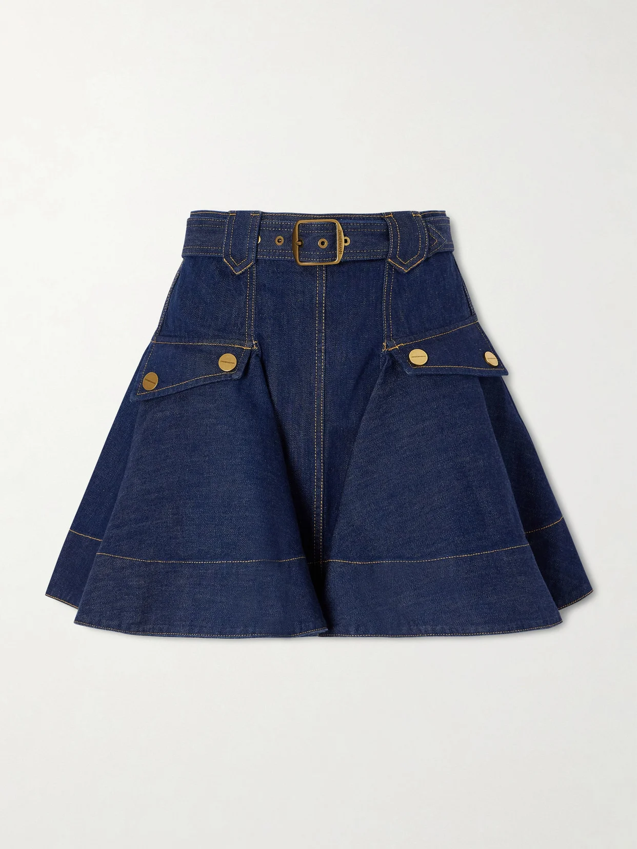 Zimmermann's Spring '26 collection is inspired by the artists who lived the bohemian dream in Lavender Bay, Sydney, in the '70s. Made from denim, this mini skirt has a flared silhouette, asymmetric flap pockets and a coordinating belt to define the waist. Wear it with everything from blouses to baby tees.