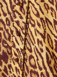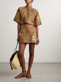 Zimmermann's shirt is made from lightweight cotton and patterned with bold leopard spots. It has a chic stand collar and swishy beads tracing the placket and cuffs.