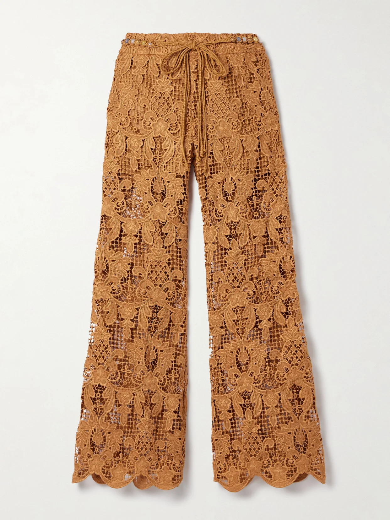 Zimmermann's pants are made from guipure lace cotton and lined with shorts for coverage. They have a mid-rise waist threaded with a bead-embellished belt and fall to flared legs. Wear yours with the coordinating top on vacation.