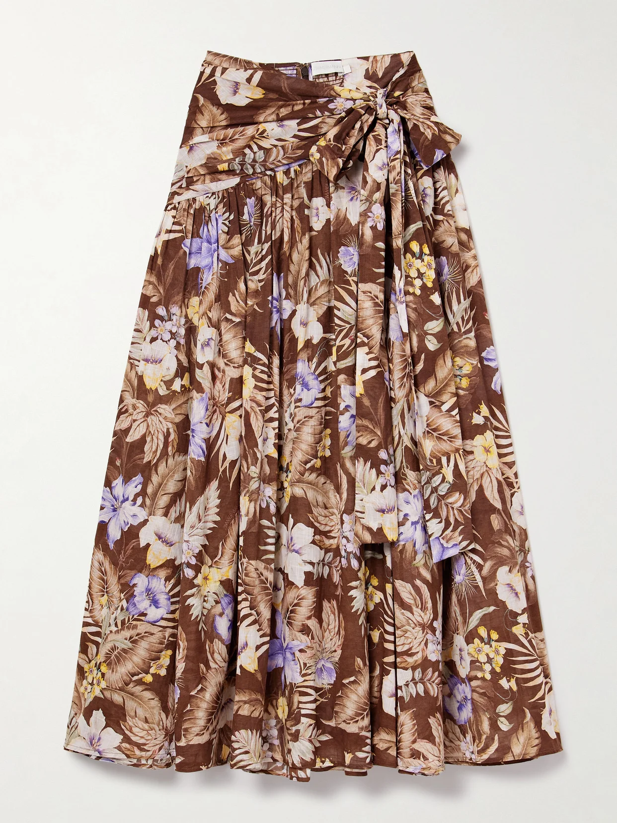 Zimmermann's skirt is printed with tropical flowers in shades of purple and yellow that really pop against the brown background. It's made from cotton-voile that's pleated throughout and has gathered panels that you can knot into a belt.