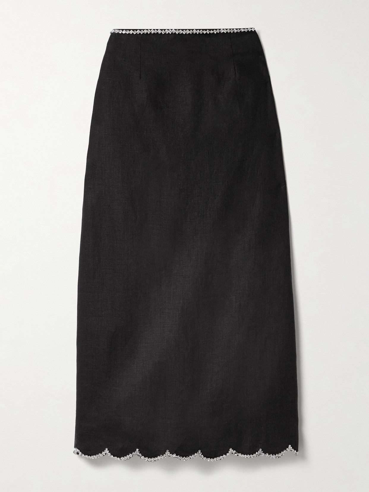 Crush Crystal-embellished Scalloped Linen Midi Skirt