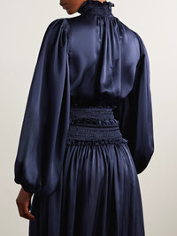 Zimmermann's 'Dream' blouse has a distinct Victorian feel, thanks to its ruffle-trimmed shirred neckline, cuffs and hem. It's cut from silk-satin in a deep navy shade and has romantic blouson sleeves. Complete the set with the matching skirt in our edit.