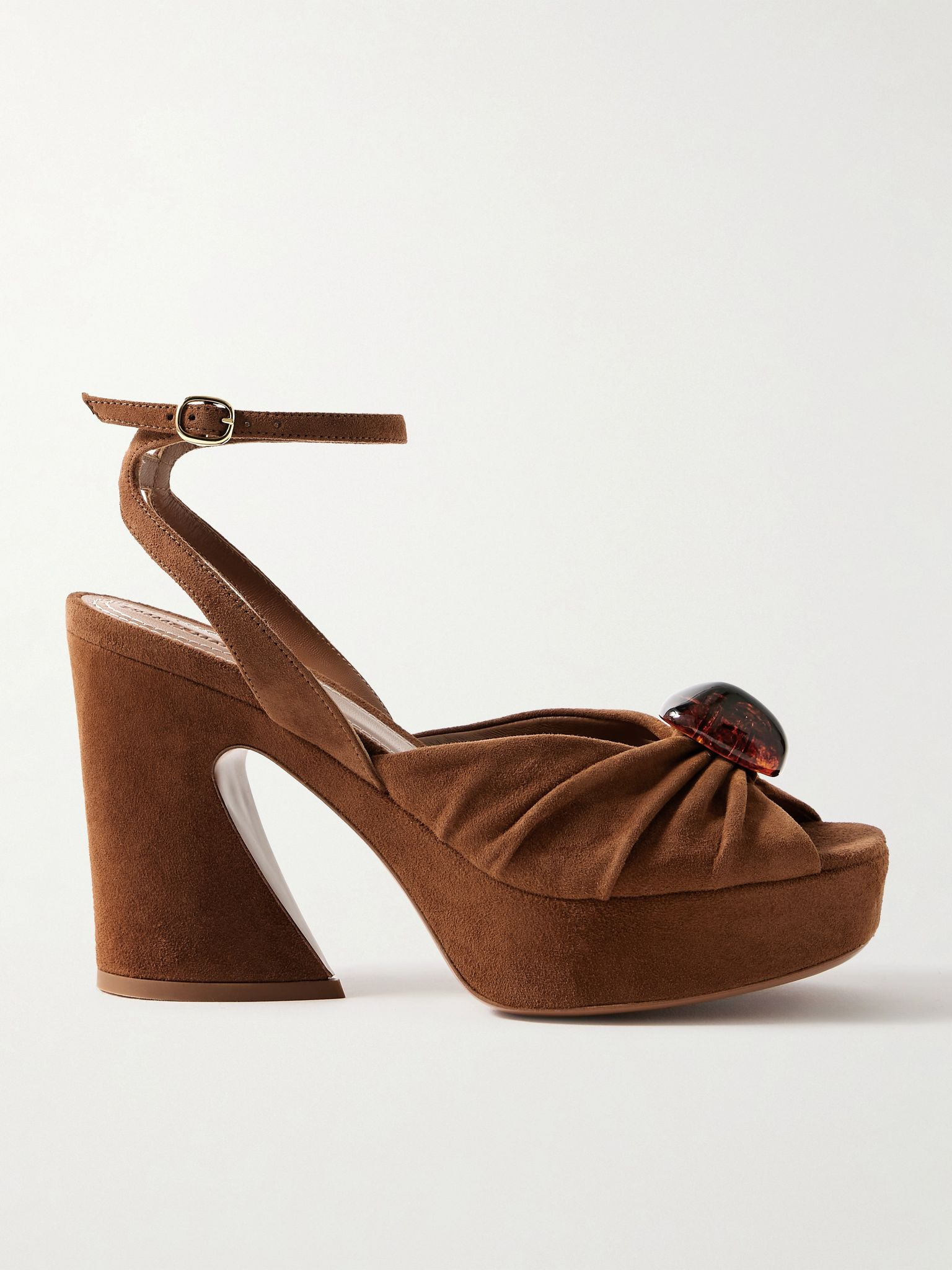 For Resort '25, Nicky Zimmermann looked to the '80s for inspiration - during that time, the founder was in design school and would often stroll around vintage shops. These 'Gleam' sandals are made from velvety suede that's gathered along the footstrap and have a polished stone-like embellishment. They rest on curved, block heels balanced by sturdy platforms. Size & Fit - Fits true to size, take your normal size - Only available in full sizes, go up to the nearest whole size if you take a half size - French sizing Details & Care - Heel measures approximately 100mm/ 4 inches with a 20mm/ 1 inch platform - Brown suede - Buckle-fastening ankle strap