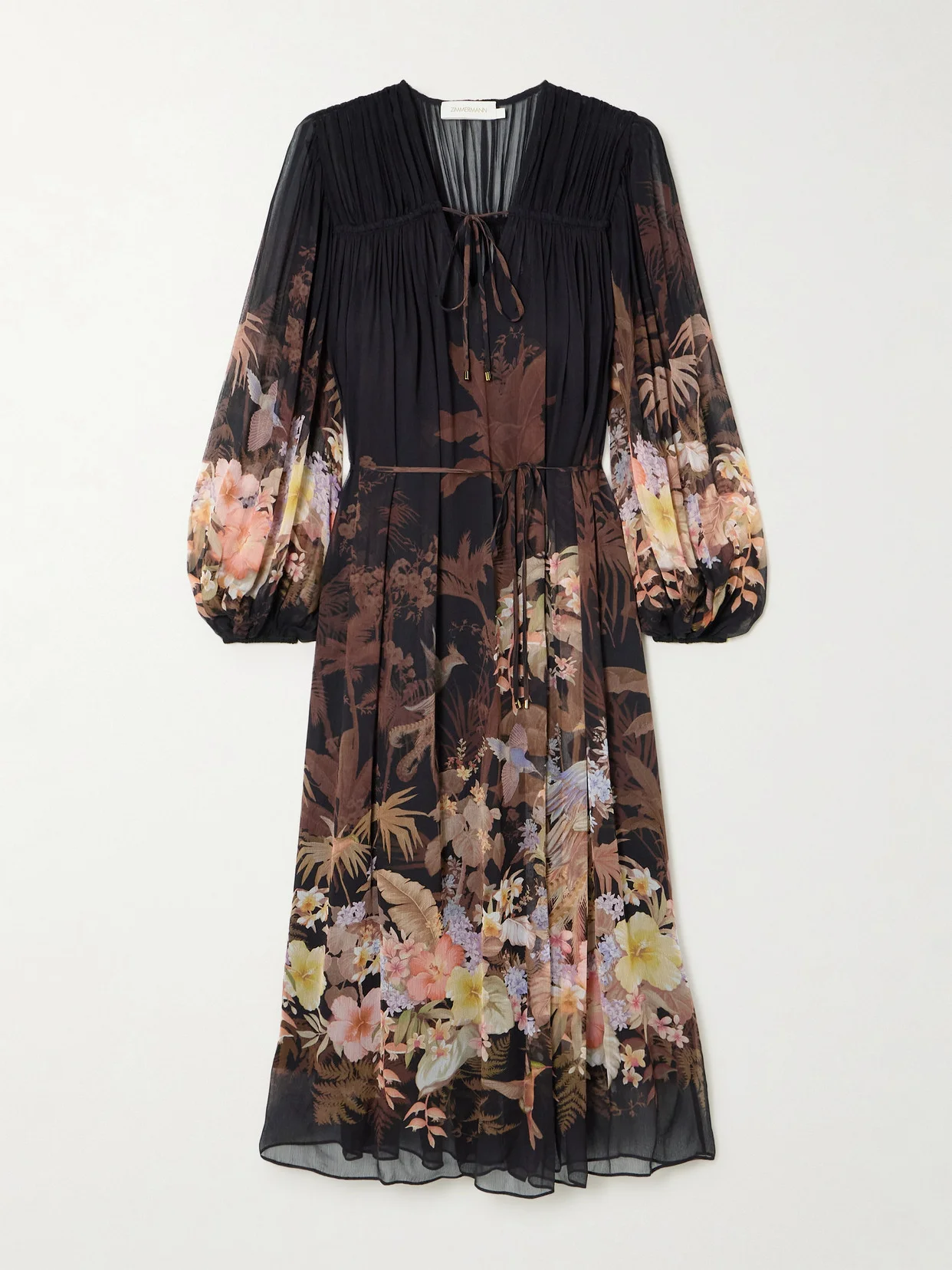 Zimmermann's romantic, contemporary prints are a signature component of the brand's aesthetic. This midi dress is made from airy crepon patterned with pretty flowers and birds that transition from tonal-brown to vibrant shades. It's gathered at the yoke and has billowy sleeves and ties at the neckline and waist to adjust the floaty shape. The tonal slip ensures coverage.