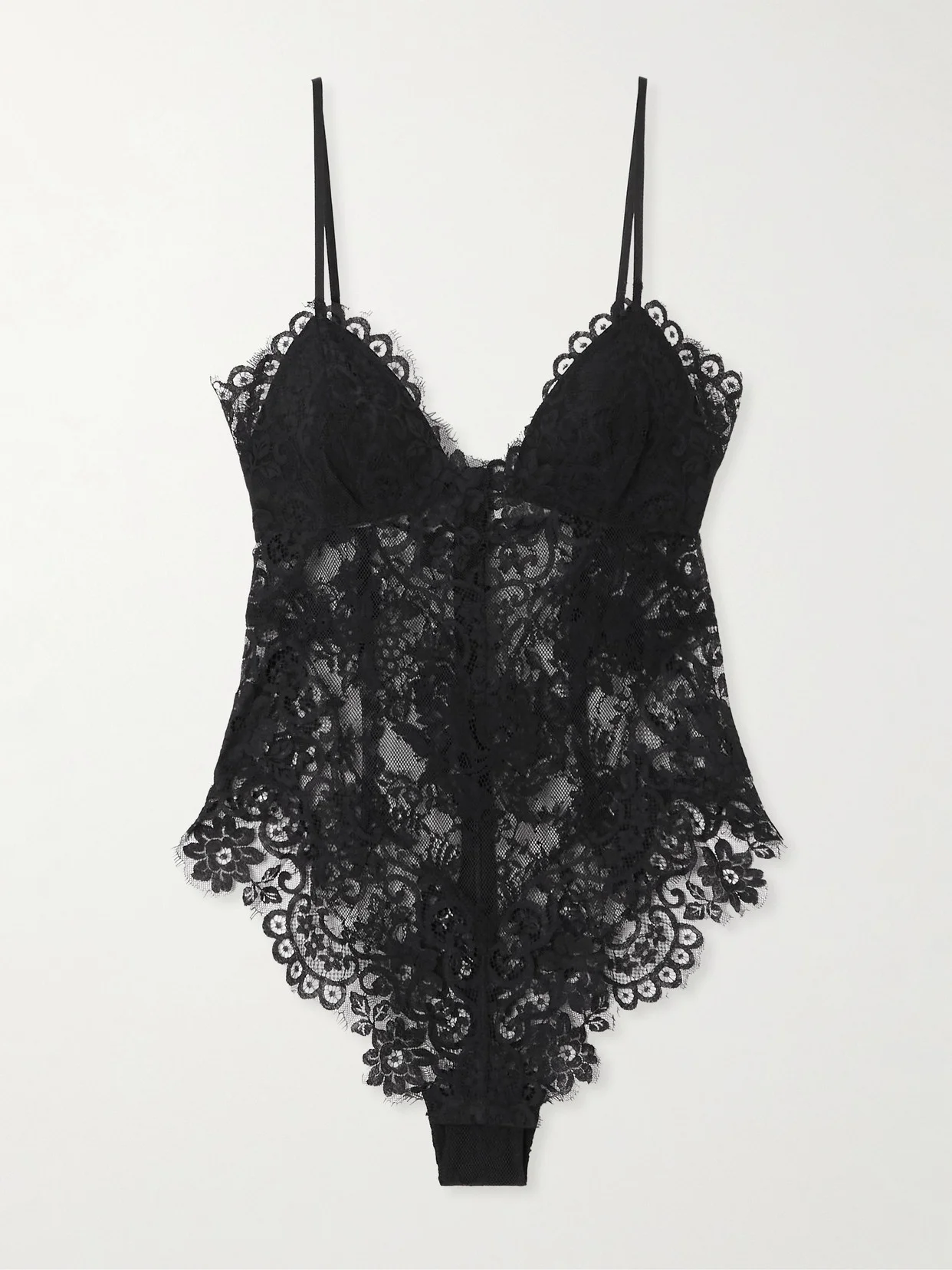 Zimmerman's bodysuit is cut from delicate lace woven with romantic floral motifs. It's lined through the cups with a semi-sheer bodice and is traced with wispy scalloped edges. Wear it with leather mini skirts or tailored pants depending on your plans.