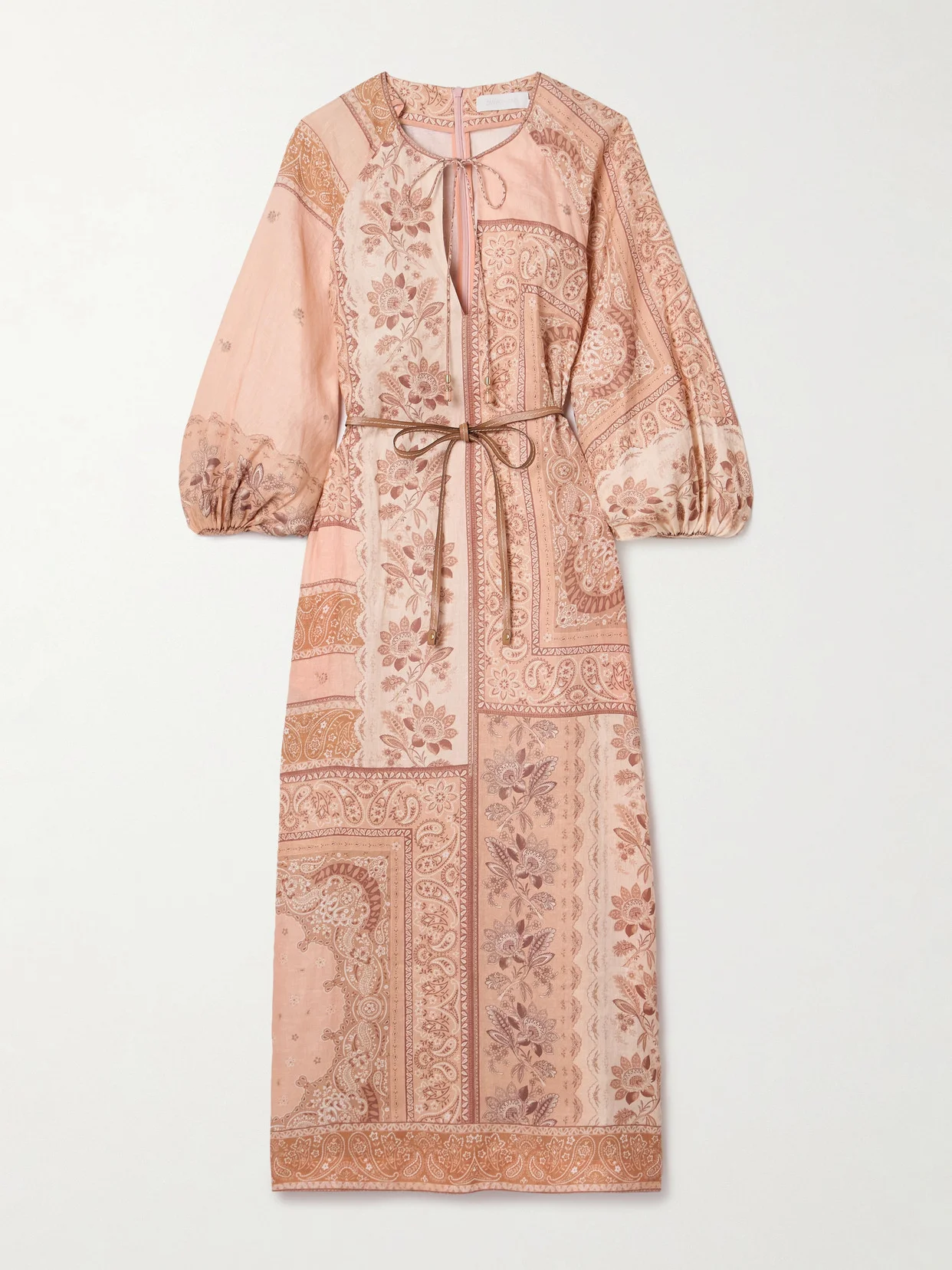 Lucky Leather-trimmed Belted Paisley-print Linen Midi Dress