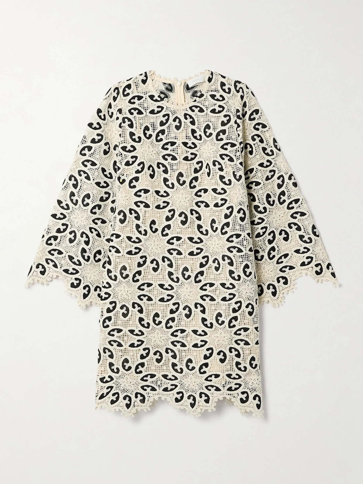 Zimmermann's 'Ottie' dress is made from cotton-blend guipure lace featuring contrasting geometric shapes reminiscent of petals. It's designed for a loose fit traced with scalloped edges and has an attached lining that ensures coverage.