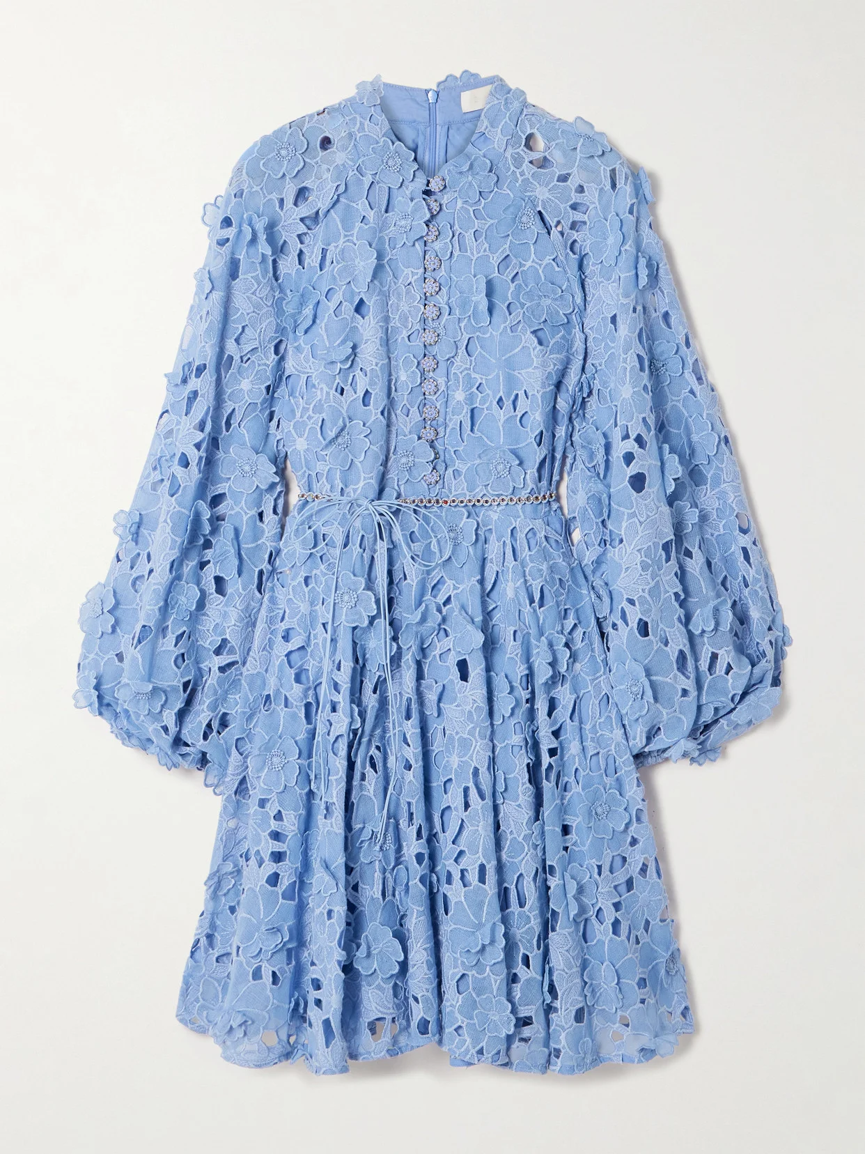 Zimmermann's 'Patience' dress is made from floral broderie anglaise cotton with appliques that give extra dimension. It has crocheted floral buttons and a beaded self-tie belt to define your waist. Wear yours with platform sandals.