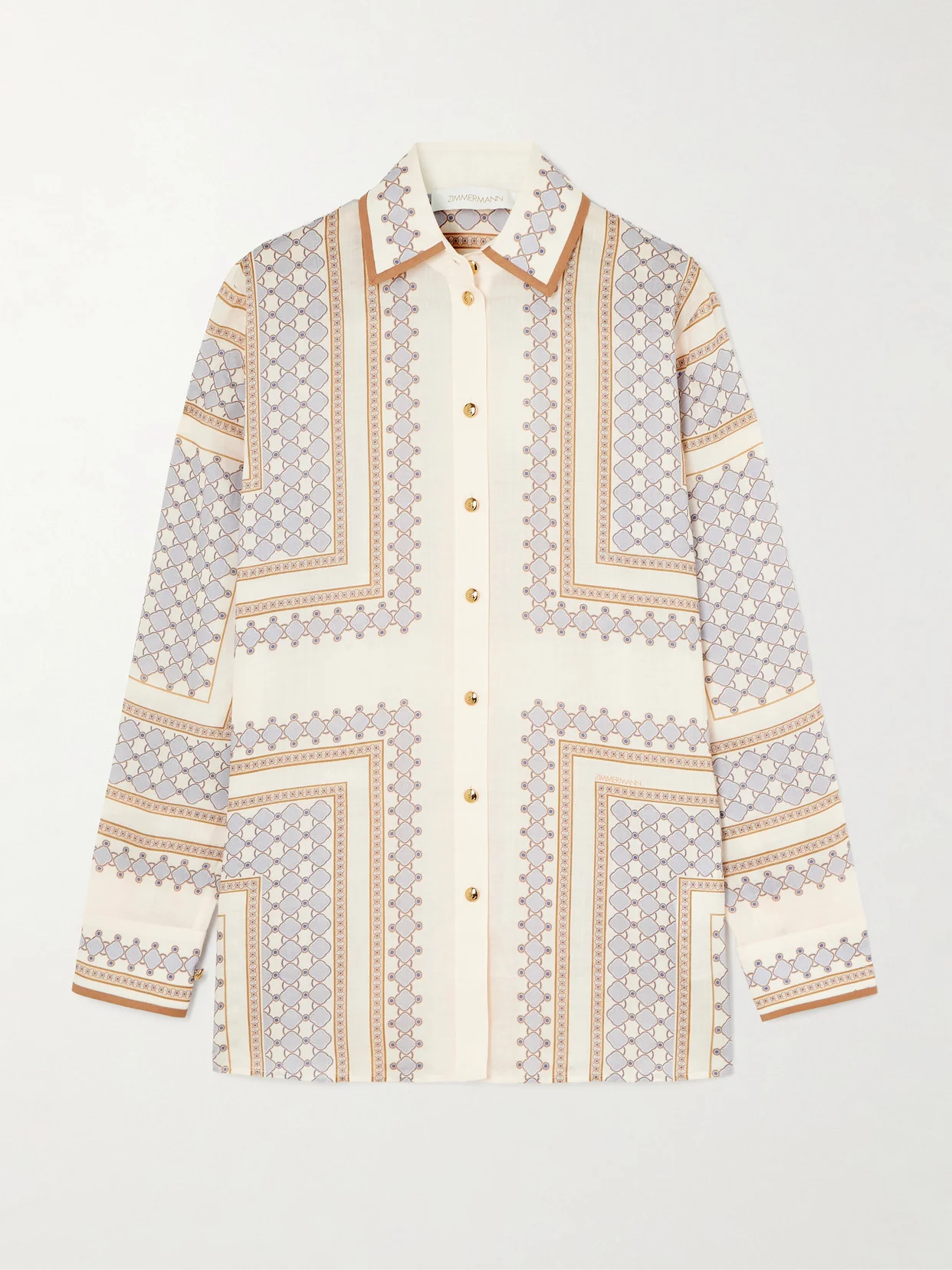 The geometric design running across Zimmermann's shirt is exclusive to the Spring '26 'Kindred Spirit' collection. It's cut to a softly relaxed shape from lightweight ramie and traced along the cuffs and collar with tonal piping. Double up with the matching pants in our edit.
