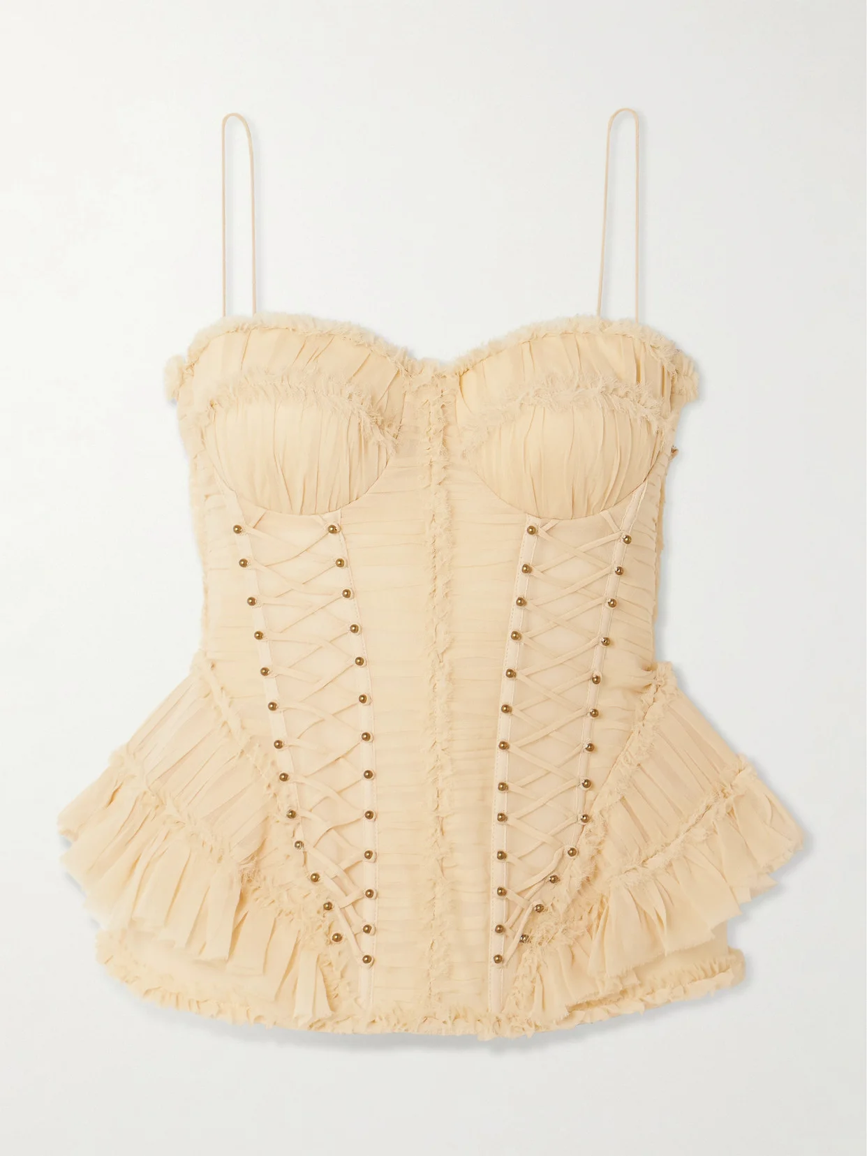 Zimmermann's 'Rebellion' corset top is part of the label's 'Twisted Romance' Cruise '26 collection, which draws on pirate tales and the New Romantics. It's made from ruched silk with internal boning and has lace-up detailing and a peplum hem.