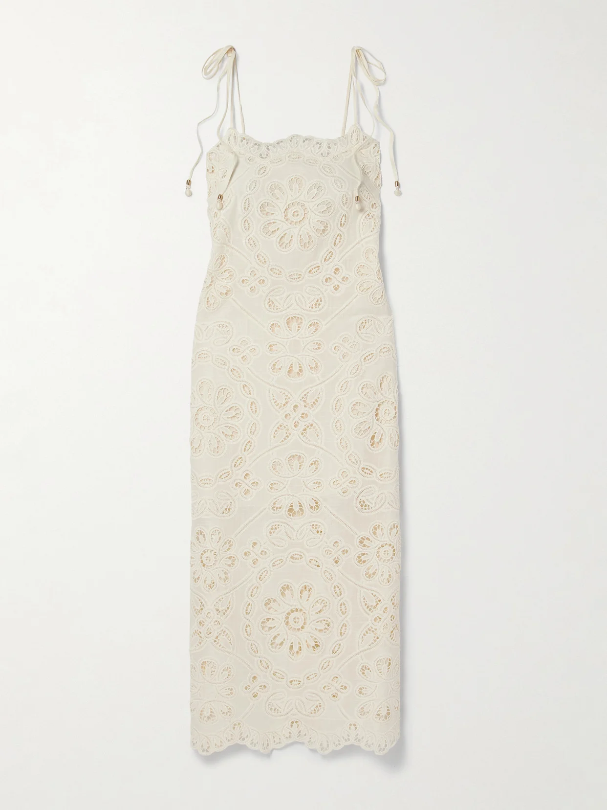 Zimmermann's midi dress is made from airy voile decorated with intricate guipure lace trims throughout, creating pretty floral motifs. It has a loose shape with scalloped edges and bead-tipped straps that can be tied to your ideal fit. The lining ensures coverage.