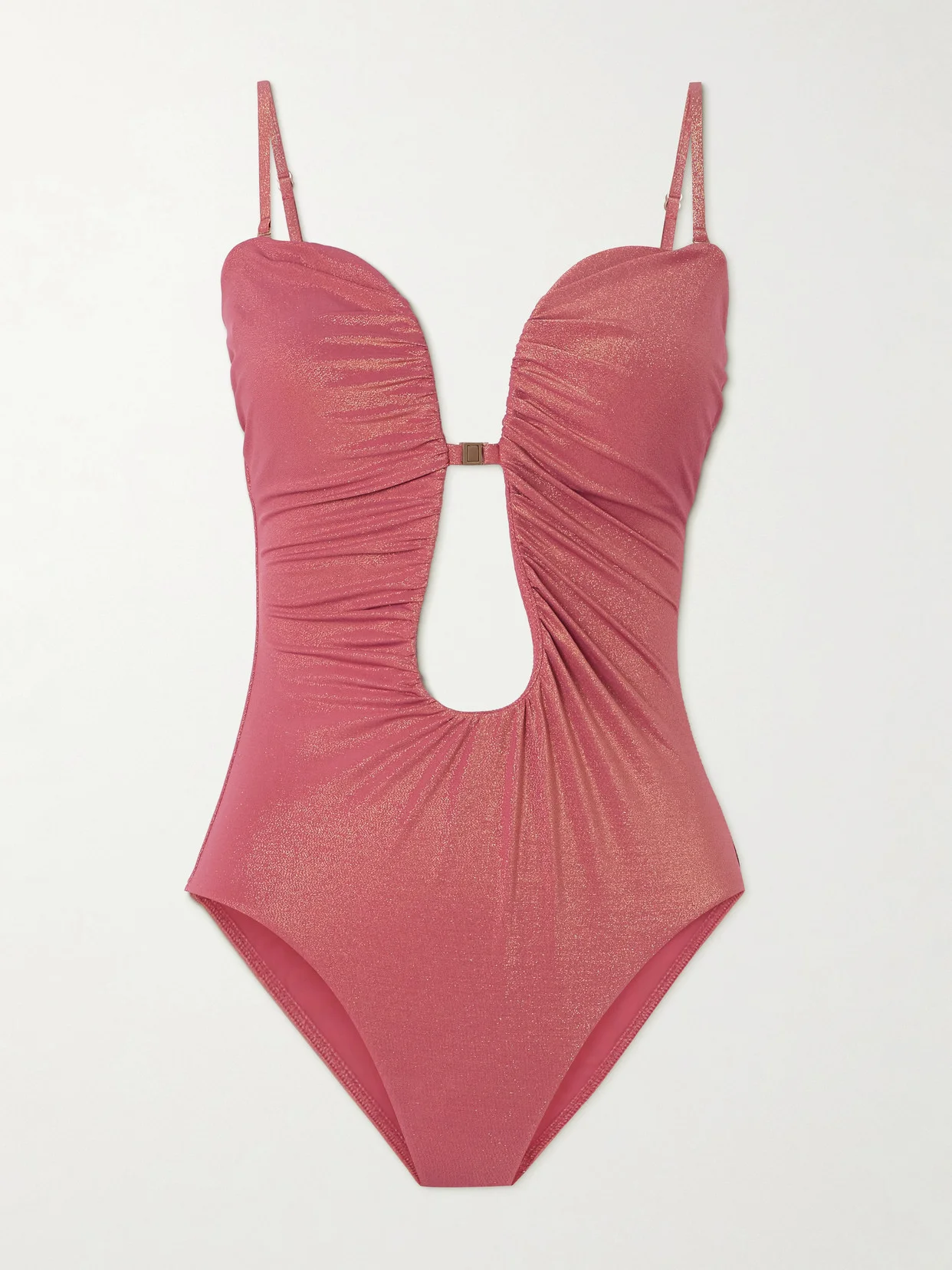 Zimmermann's swimsuit is made from metallic stretch fabric that shimmers in the sunlight. It has a strapless, plunging neckline with a U-shaped ring to keep it securely in place.