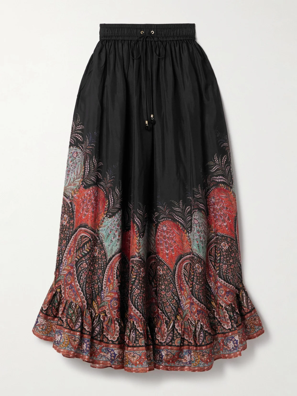 Zimmermann's skirt is printed with an intricate paisley motif in rich jewel tones. It's cut from organic silk and has an elasticated drawstring waistband and ruffled hem. Style it with the matching blouse from the collection. Lower-Impact Materials. This product is made using at least 50% lower-impact materials or ingredients. Find out more about our NET SUSTAIN criteria here.