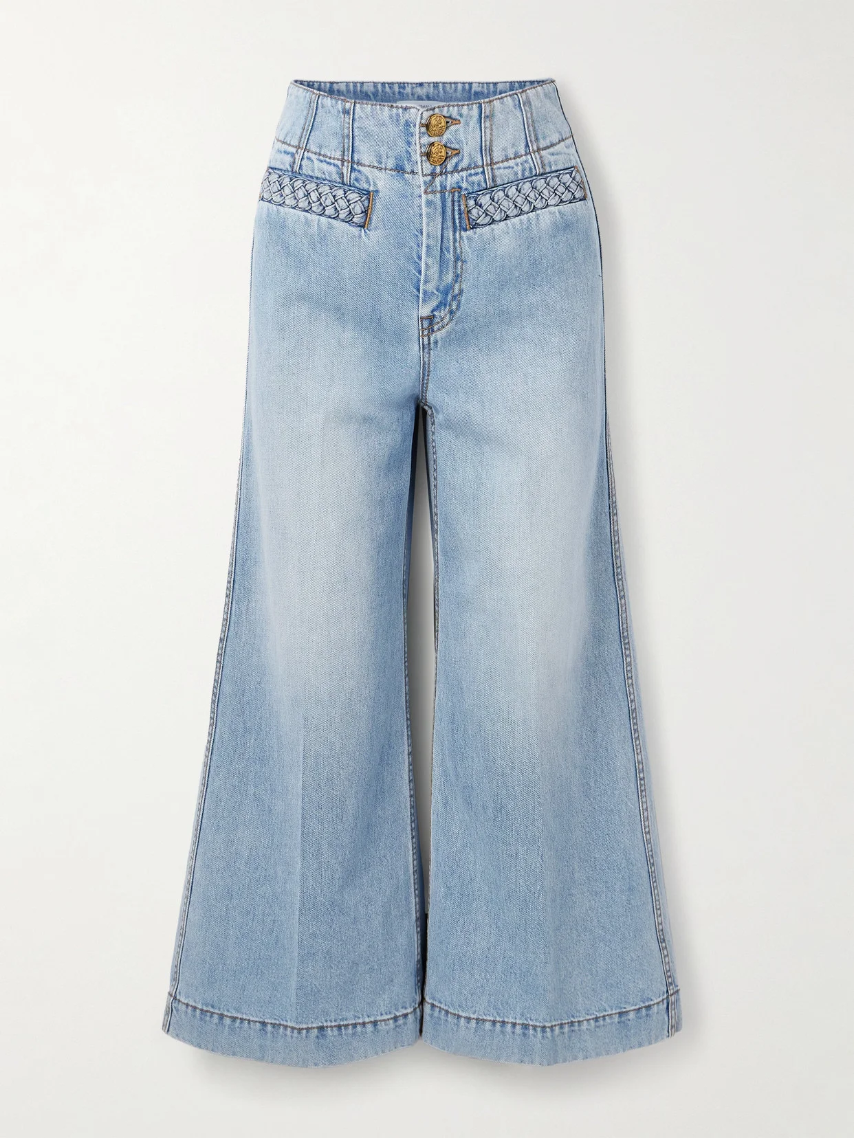 Zimmermann's 'Wanderlust' jeans are designed with so many unique details, like ocean-carved buttons and intricately woven pockets. They're cut from light-blue denim and have cropped, wide legs.
