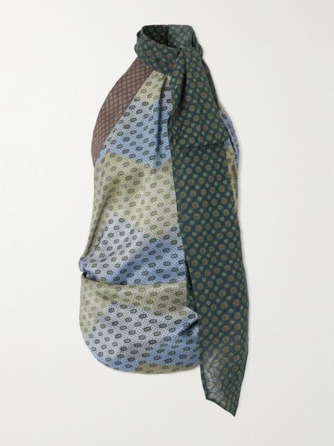 Velvet-trimmed Gathered Printed Crepe De Chine Halterneck Blouse